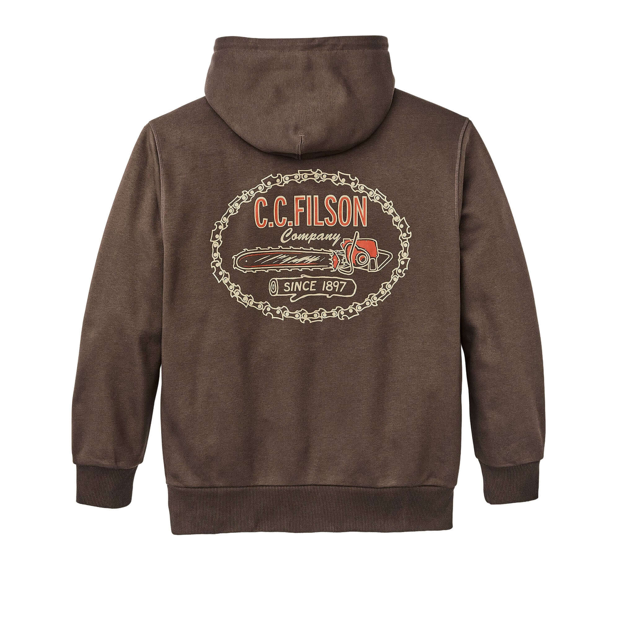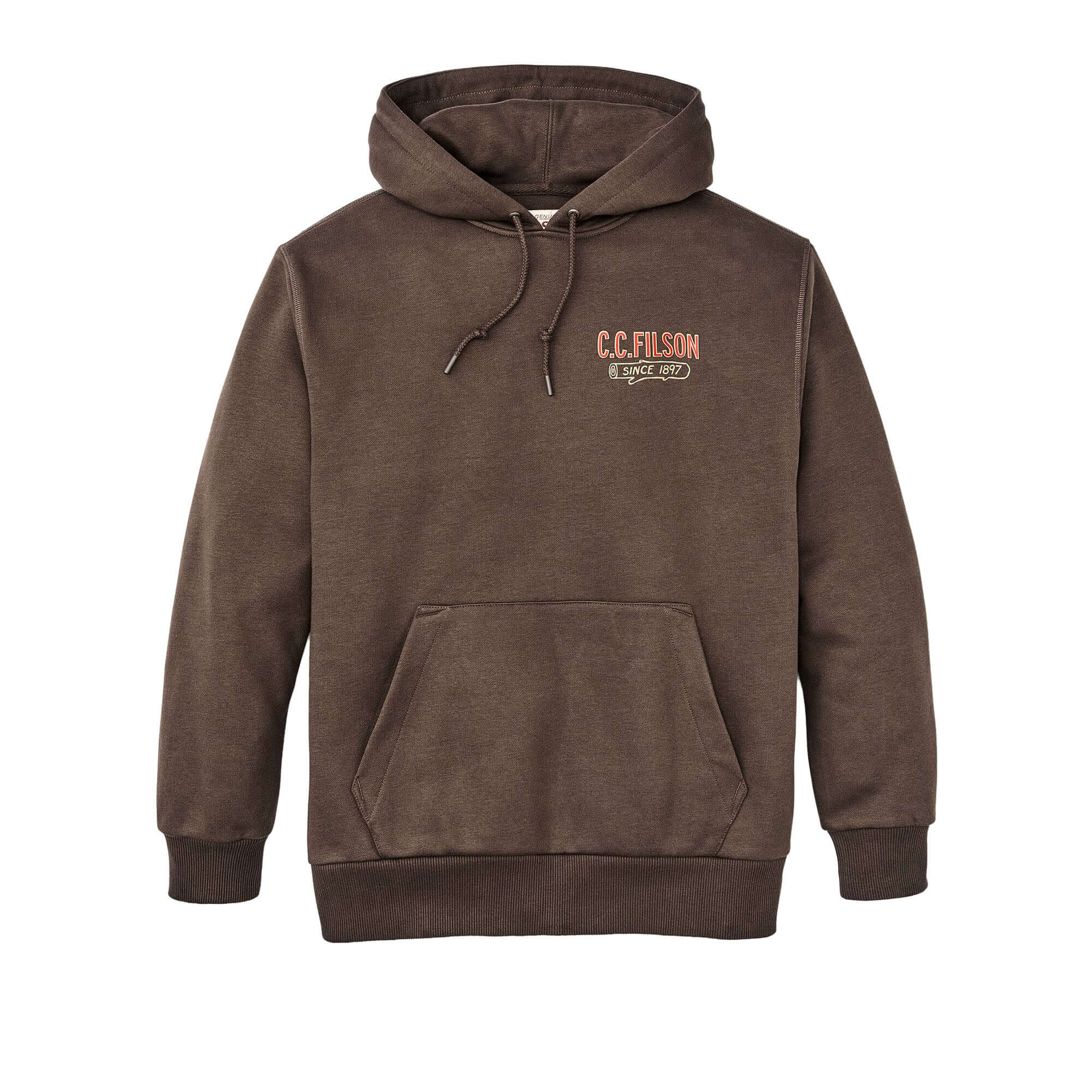 Il robusto tessuto in 75% cotone e 25% poliestere presenta un interno isolante che trattiene il calore e una superficie esterna liscia che resiste al pilling. Il poliestere incluso nella composizione aiuta a evitare che il capo si restringa. L’orlo e i polsini sono caratterizzati da una robusta lavorazione a coste larghe che assicura una vestibilità su misura e un’elasticità eccezionale, permettendo al modello di mantenere la forma. L’ampio cappuccio può essere indossato sopra un cappellino da baseball ed è regolabile per mezzo della coulisse, perfetto per proteggersi dalle folate di vento. Completano il look la tasca frontale a marsupio e la grafica personalizzata disegnata da Filson.