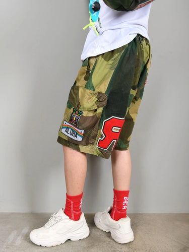 Bermuda camou tasconato con maxi passanti e patch applicate in puro cotone.