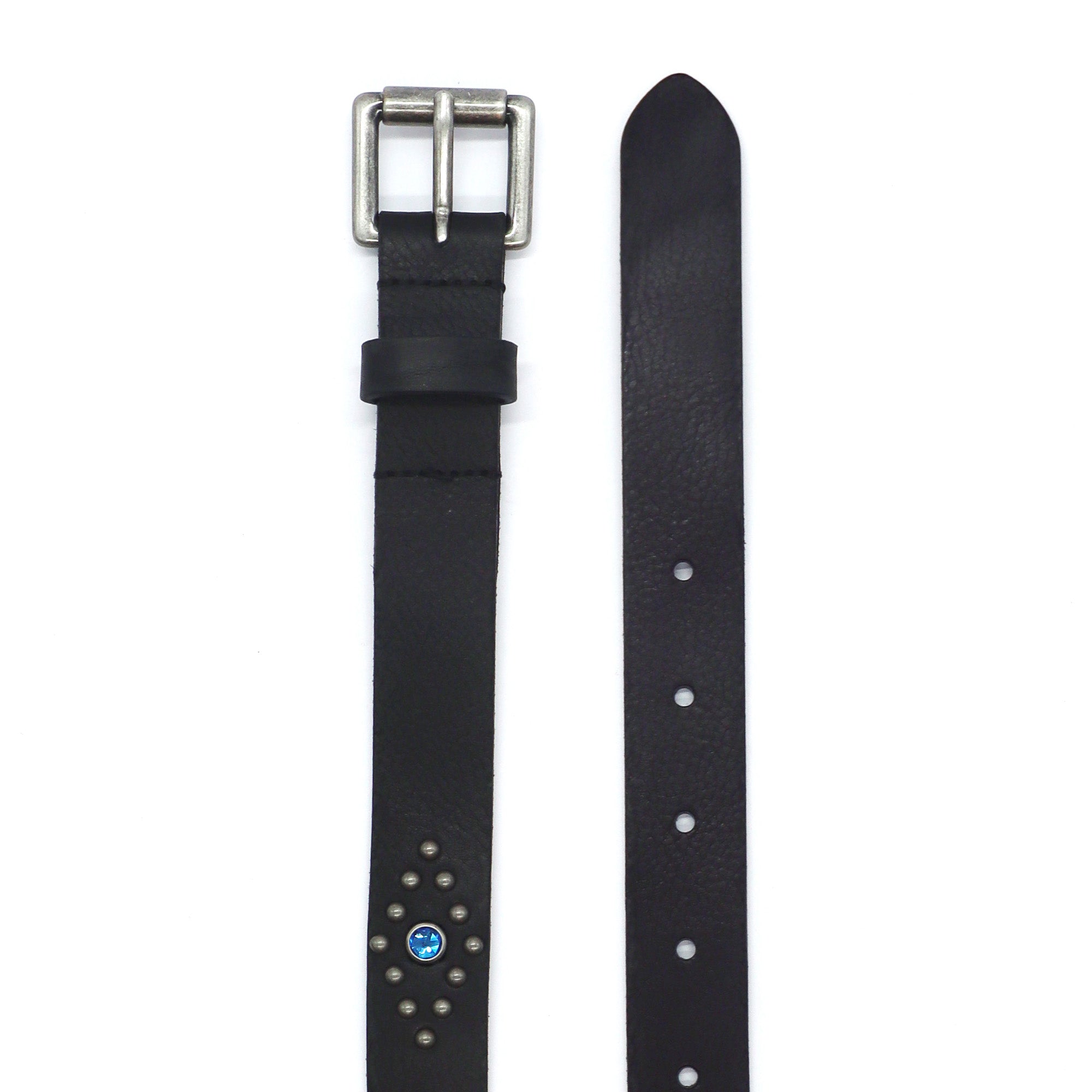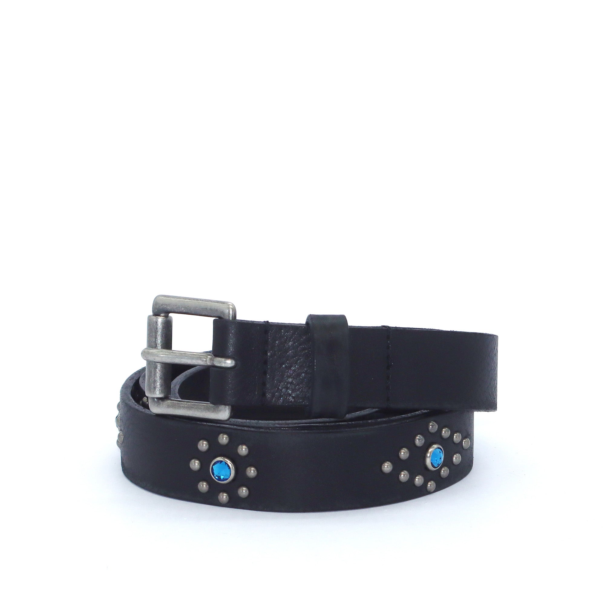 Belt in Black, featuring silver-tone metal stud patterns and turquoise crystal details. Crafted in Italy, 100% cow leather.