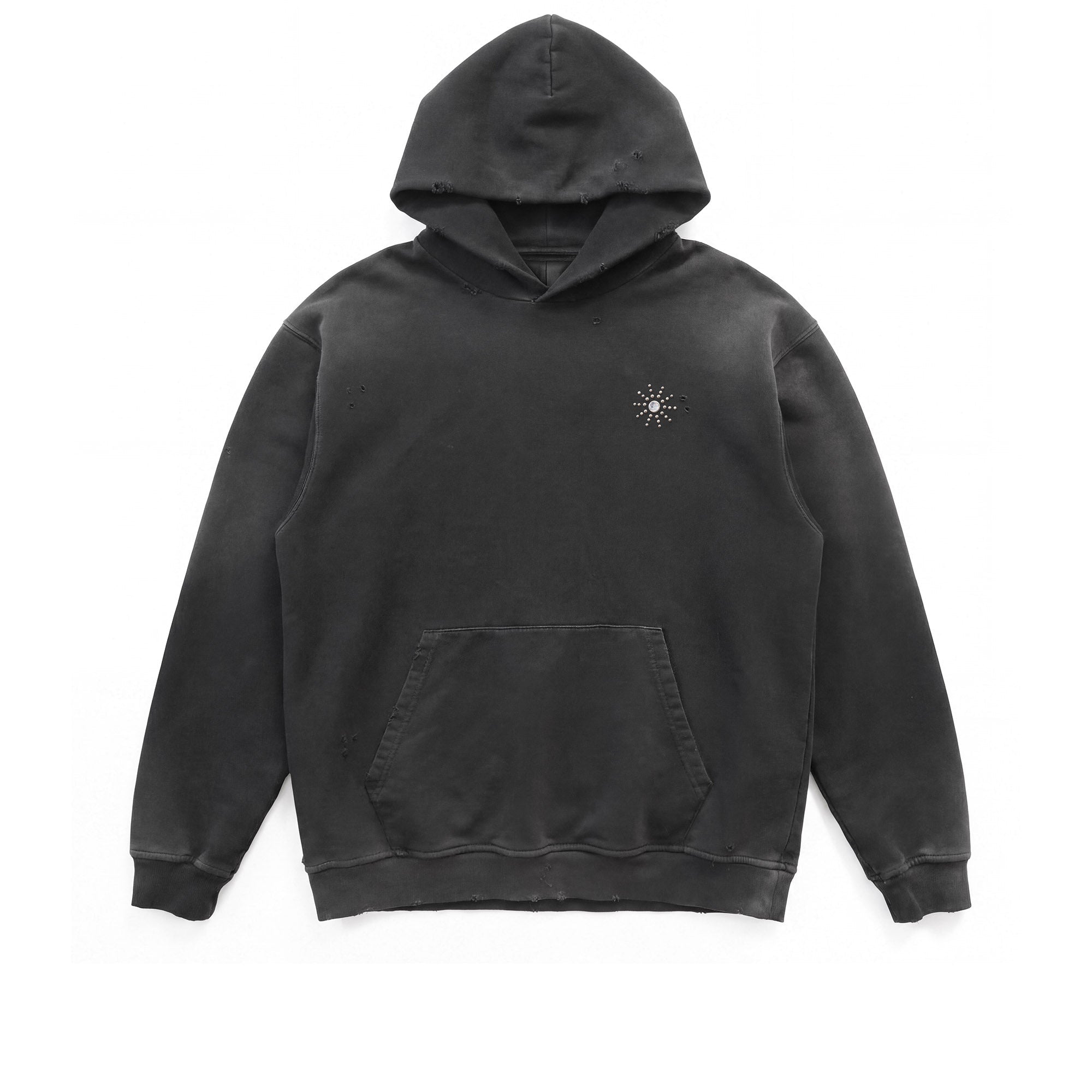 Black oversize fit hoodie with a vintage wash, featuring a studded sun motif on the chest with a central gemstone accent, complemented by deliberate distressed detailing and small holes. Crafted in Italy, 100% cotton.