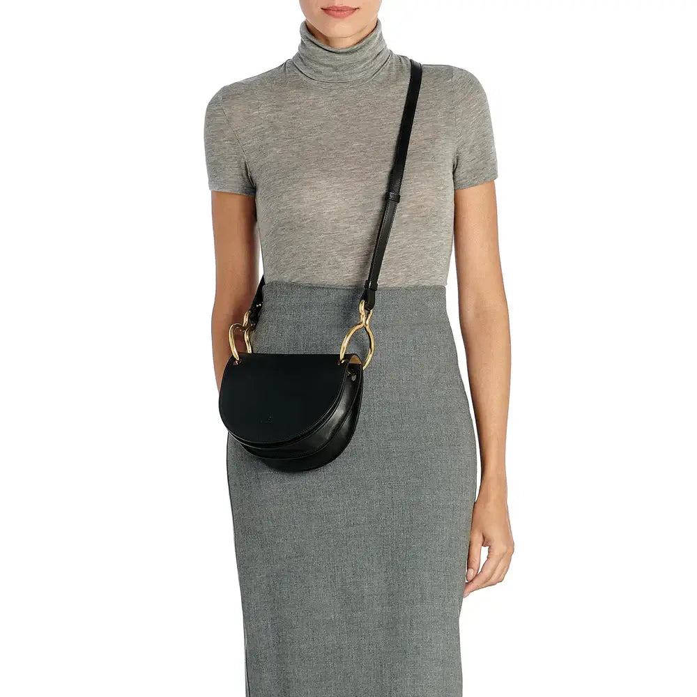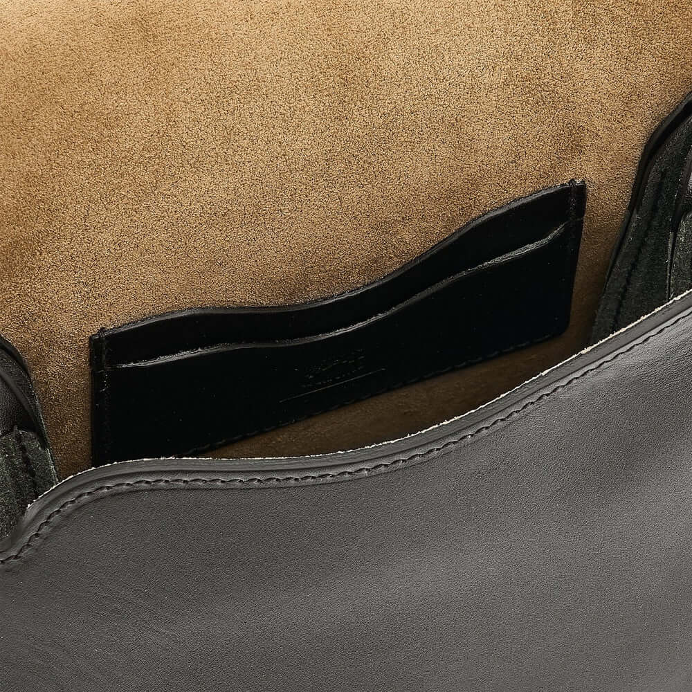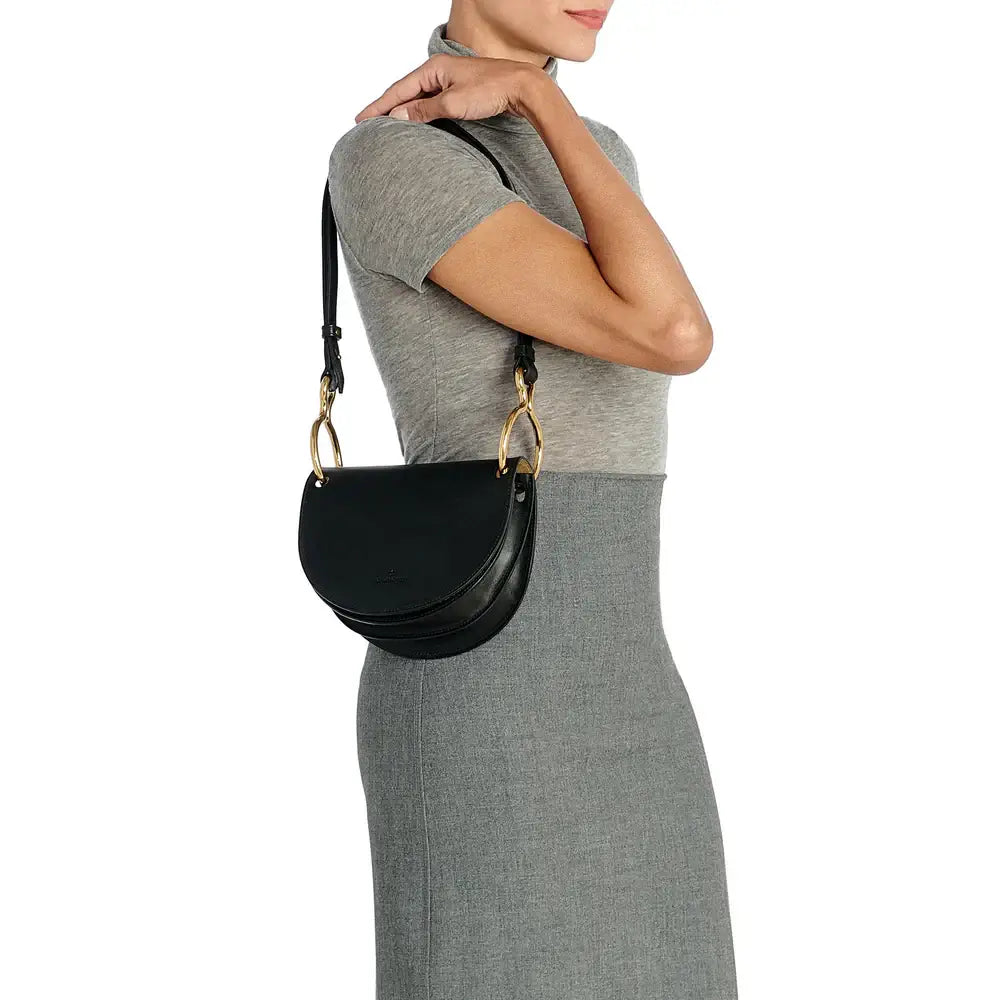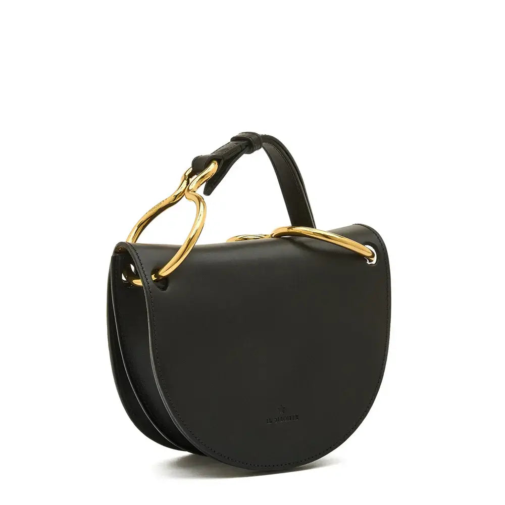 Borsa da donna in pelle di vacchetta conciata al vegetale con grandi anelli-gioiello in ottone, patta e tracolla regolabile. Made in Italy.Si indossa cross-body o a spalla regolando la lunghezza della tracolla con gemelli di ottone. Chiusura sotto-patta con bottone magnetico. Apertura a soffietto. L'interno, foderato in suede, ospita una doppia taschina aperta per carte di credito e documenti.
