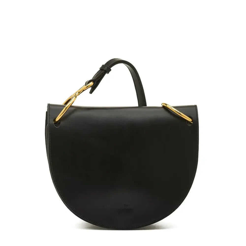 Borsa da donna in pelle di vacchetta conciata al vegetale con grandi anelli-gioiello in ottone, patta e tracolla regolabile. Made in Italy.Si indossa cross-body o a spalla regolando la lunghezza della tracolla con gemelli in ottone. Chiusura sottopatta con bottone magnetico. Apertura a soffietto. L'interno, foderato in suede, ospita una doppia taschina aperta per carte di credito e documenti.