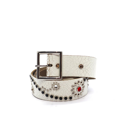 Belt in White crackle-effect leather, featuring silver-tone flower stud patterns with red, black, and amber crystal accents. Crafted in Italy, 100% cow leather.