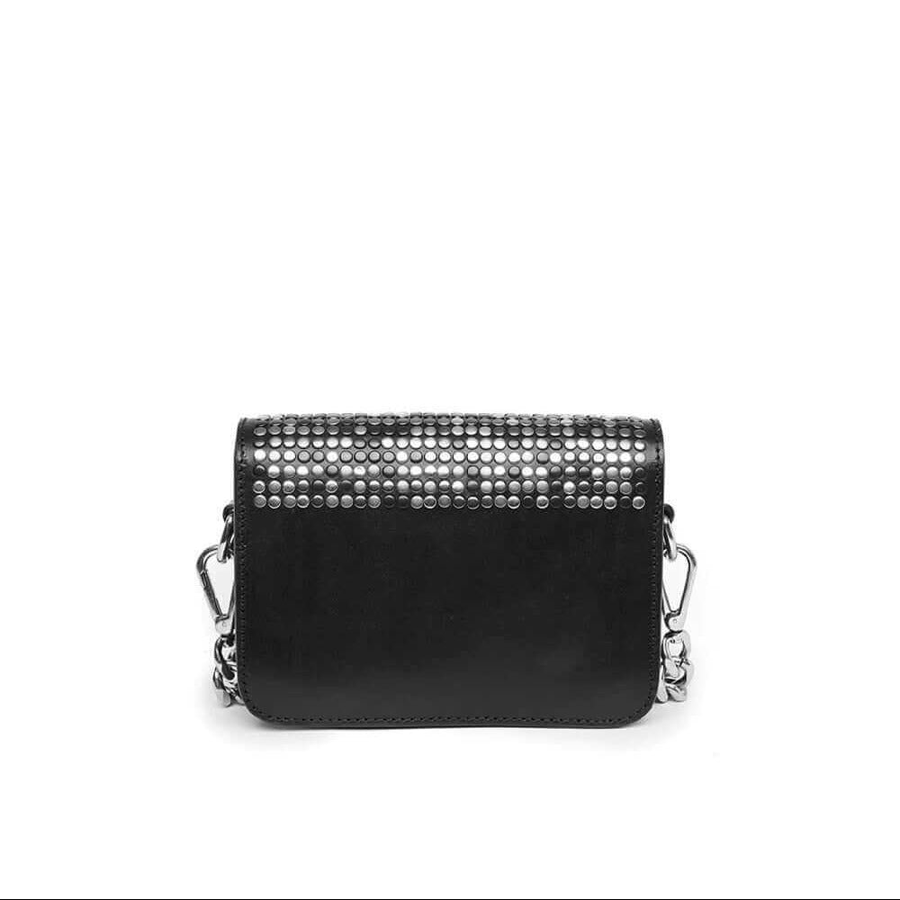 Black leather mini bag. Front flap with snap button closure. Front silver colored metal logo detail. Studded outline on the front. One internal patch pocket. Leather lining. Shoulder leather strap and metal chain little strap. Made in Italy. 100% Leather. Lenght: 18,5 cm, Height: 14 cm, Depth: 6 cm.