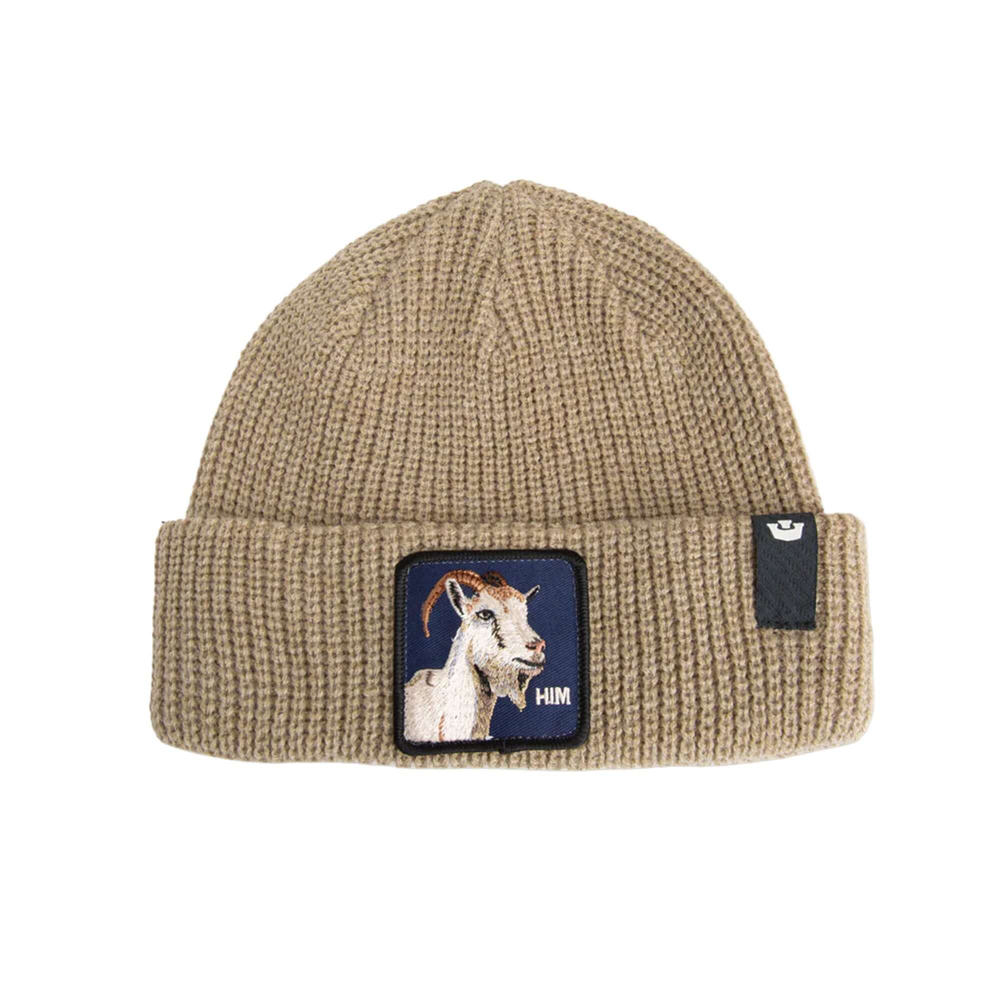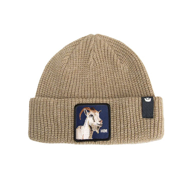 Maglia color cuoio con toppa a forma di capra e scritta "HIM". Comodo, sicuro di sé e arrogante nel senso migliore del termine: questo berretto non solo ti scalda la testa, ma la corona.