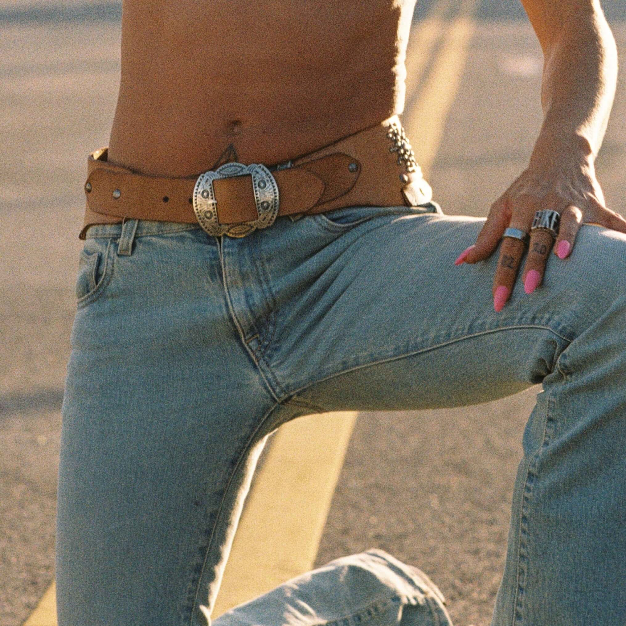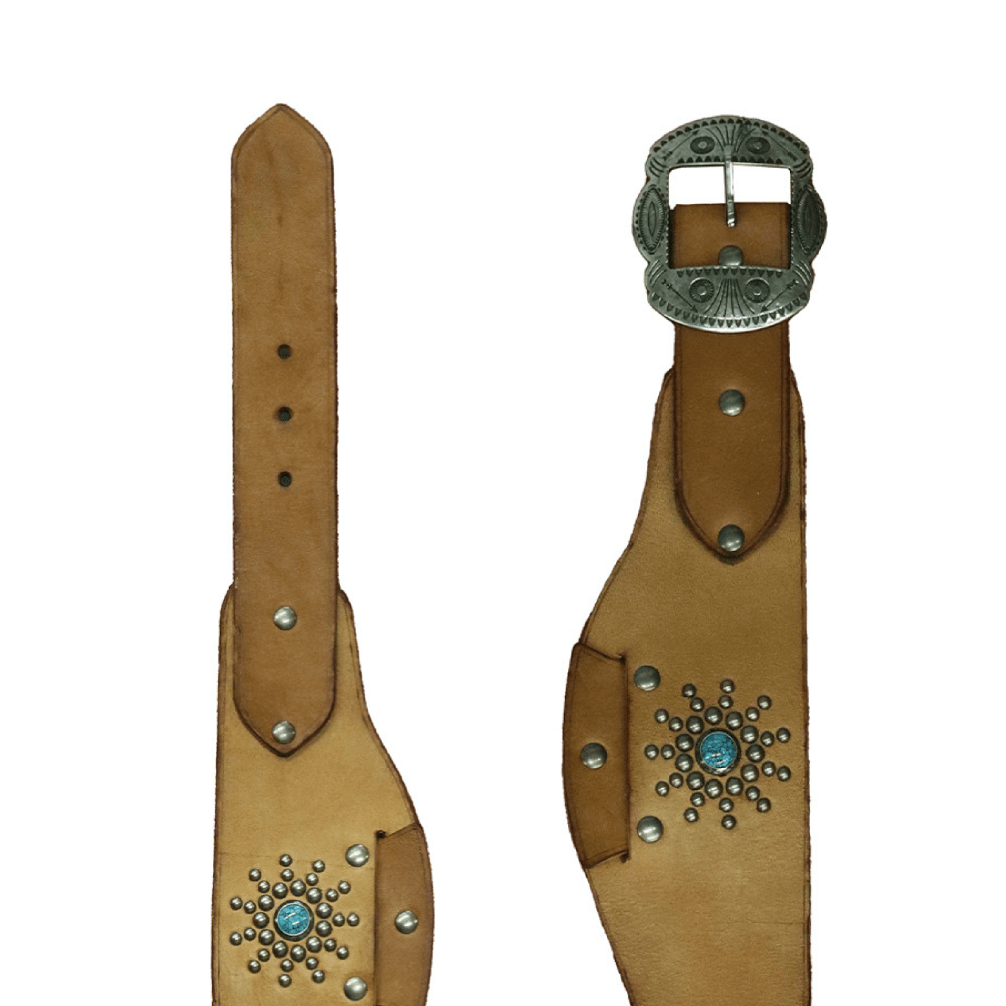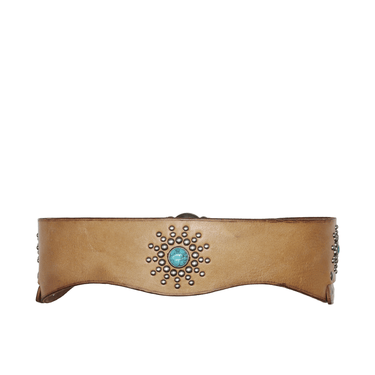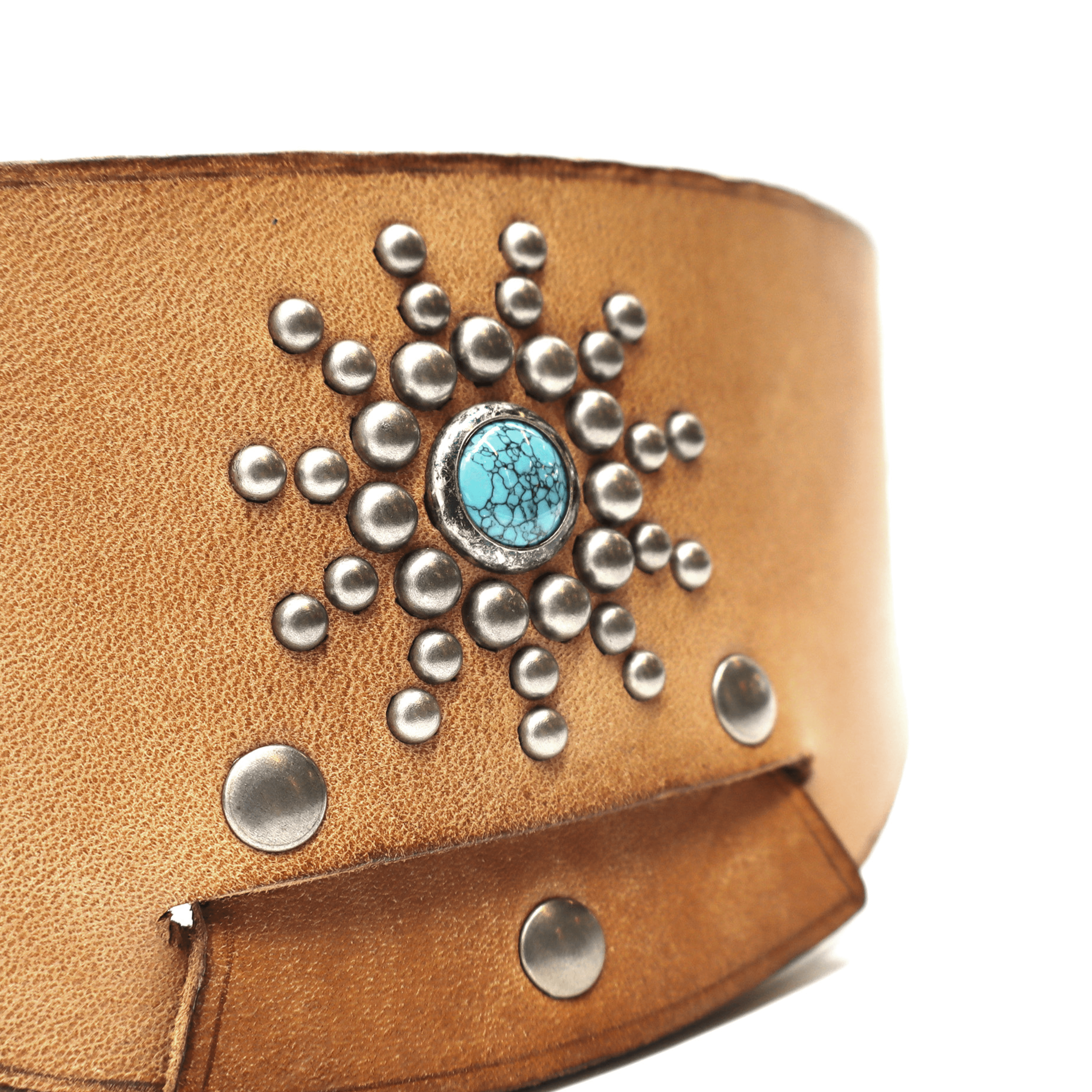 Belt in Cognac, featuring a bold 83mm silhouette and sun-studded details.