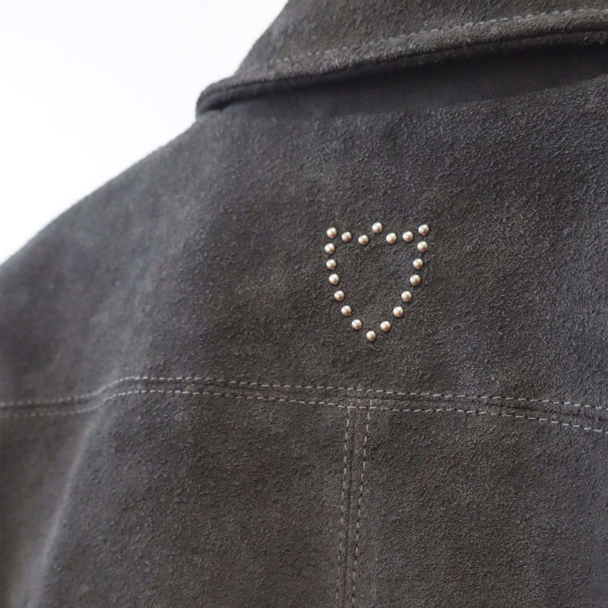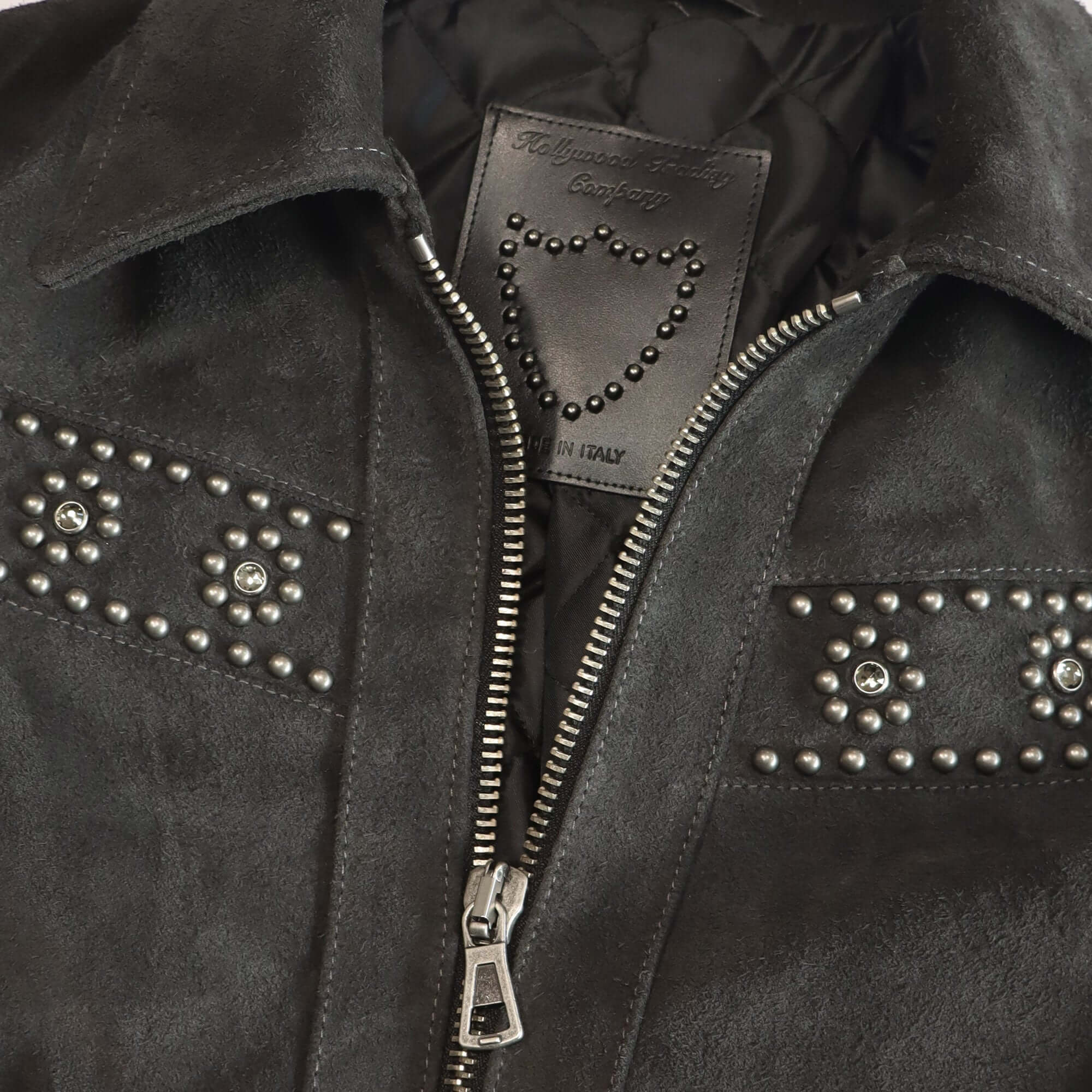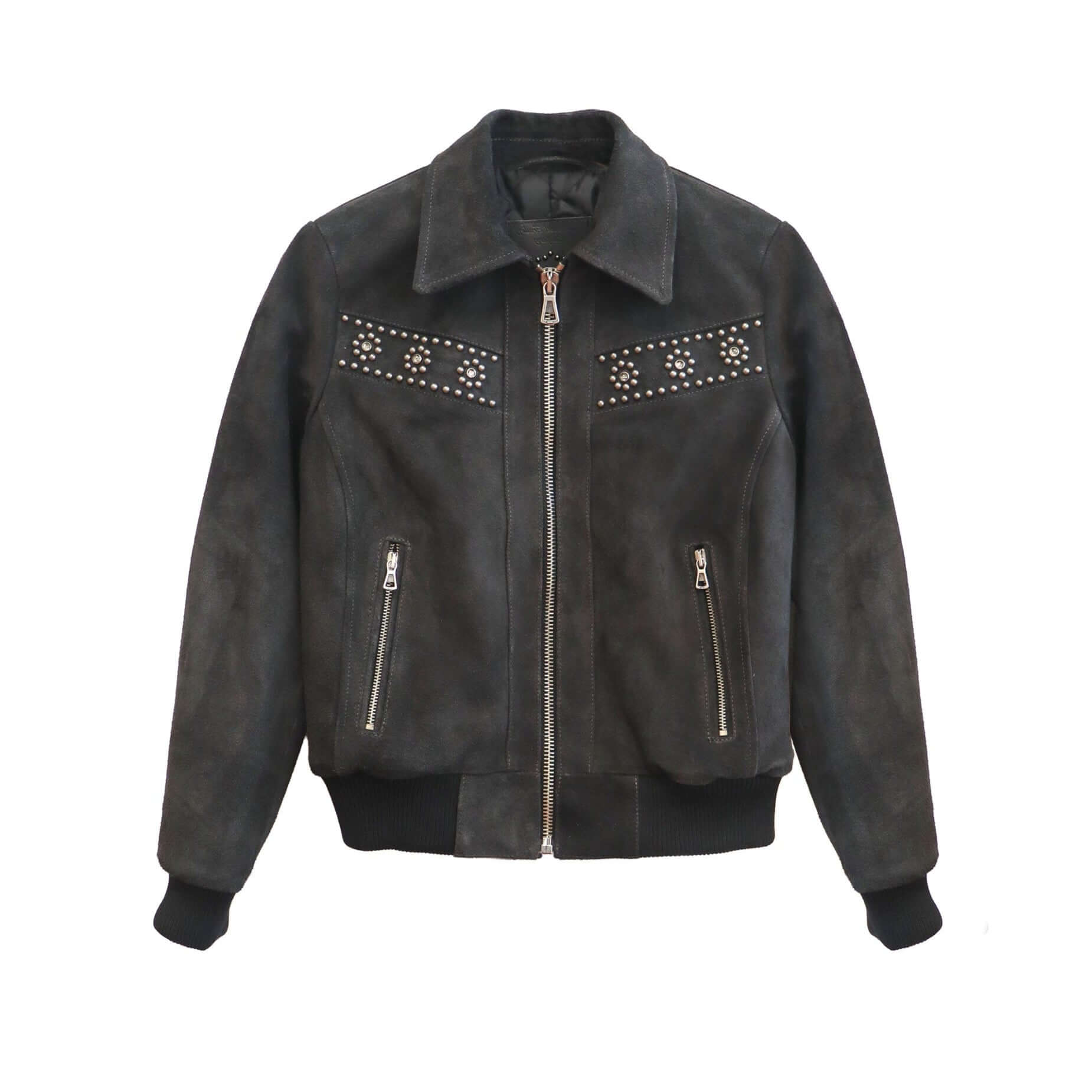 Anthracite Suede Woman Jacket featuring floral studded details on the front.