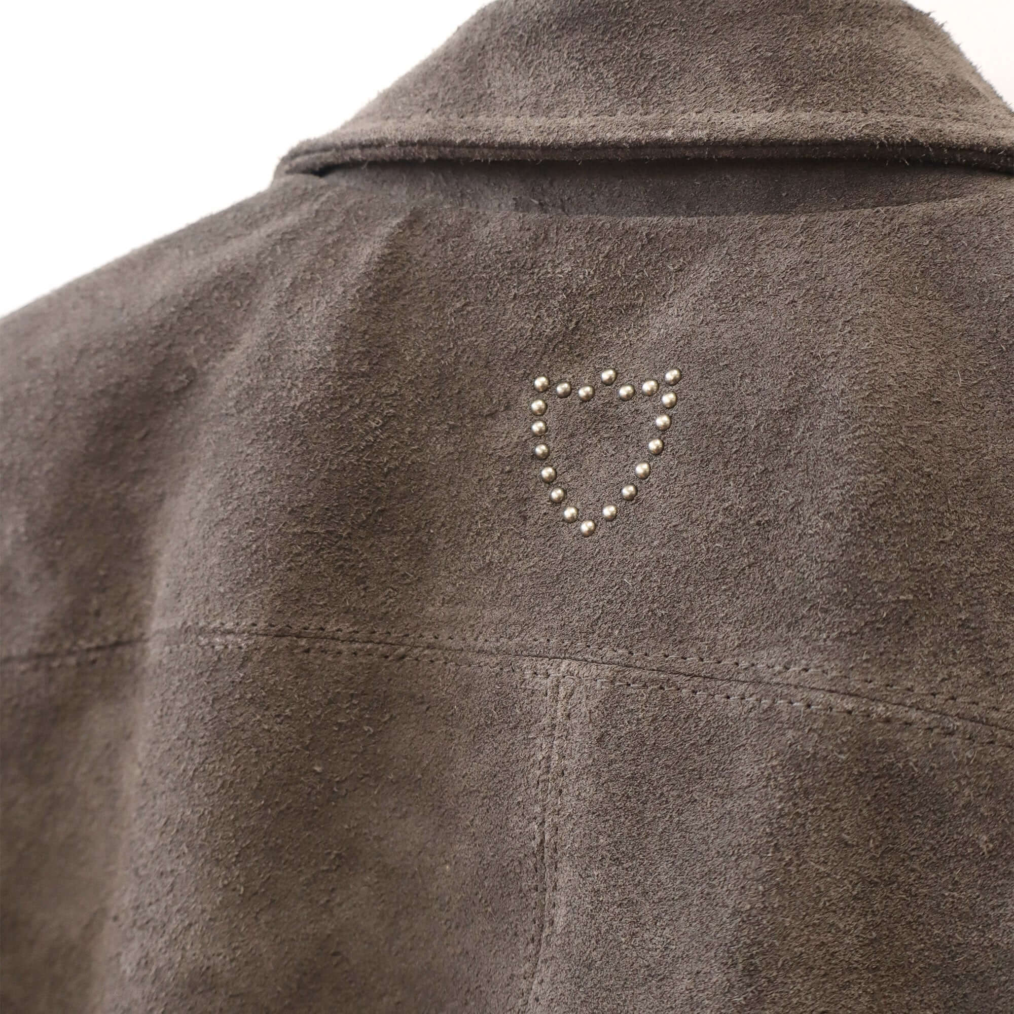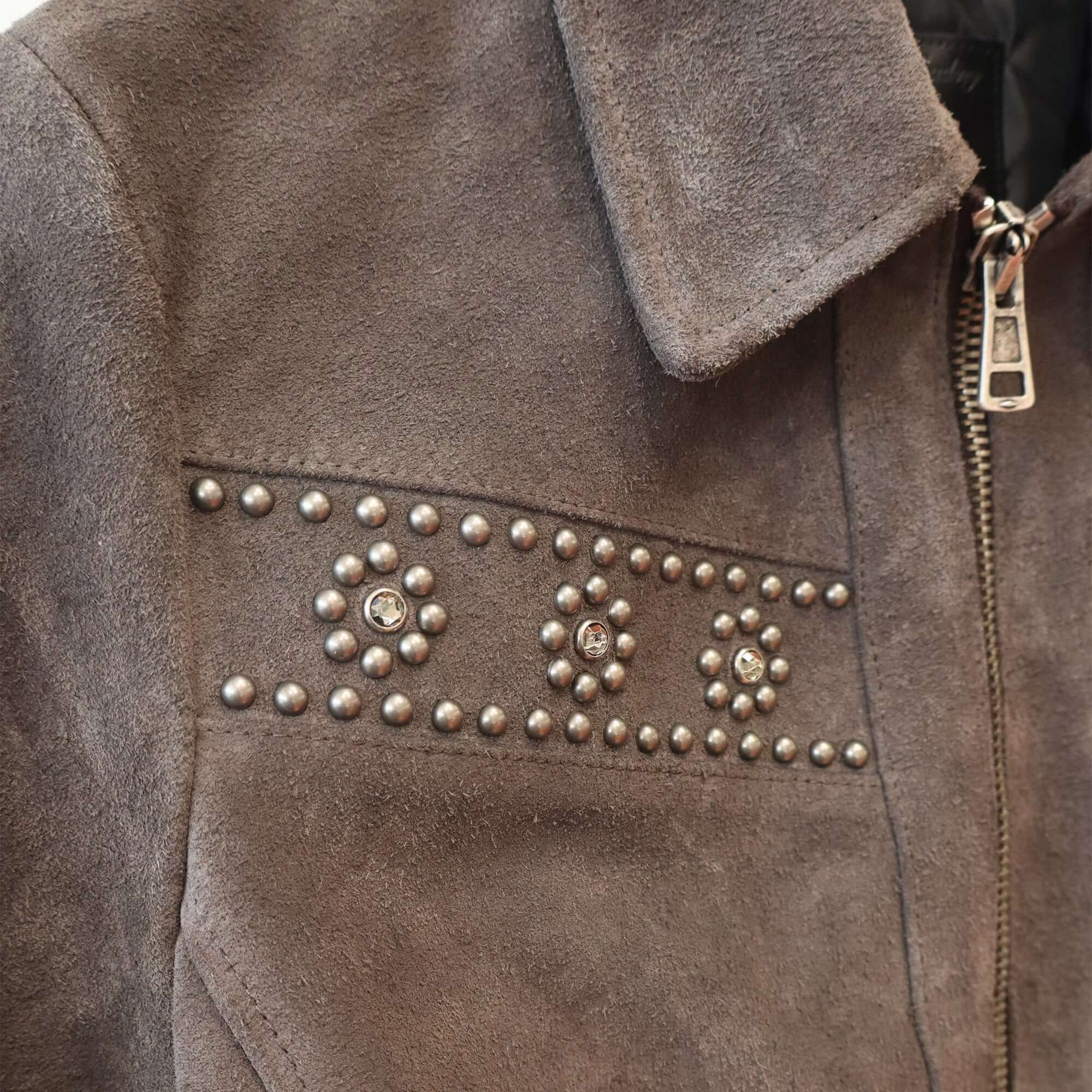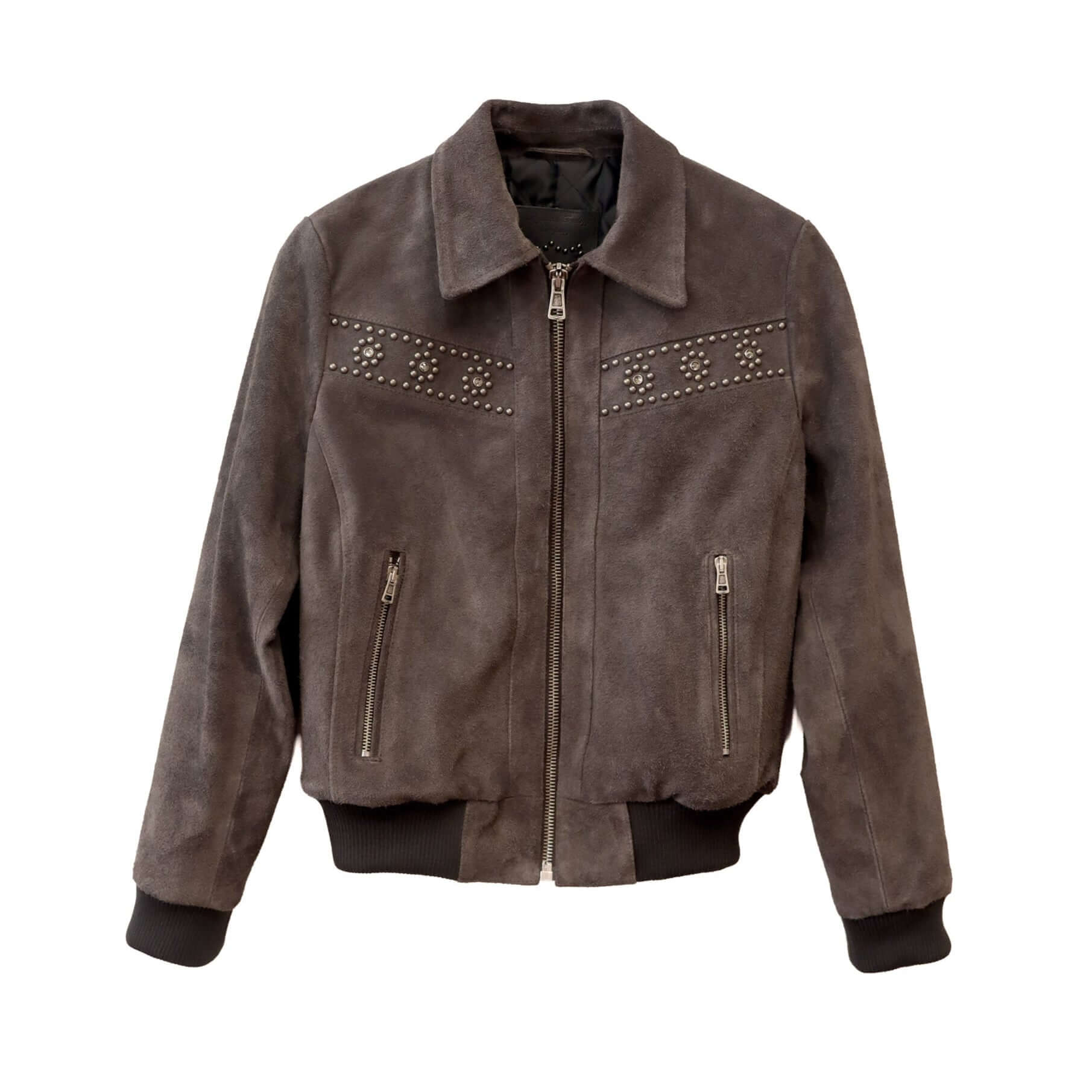 Dark Chocolate Suede Woman Jacket featuring floral studded details on the front.