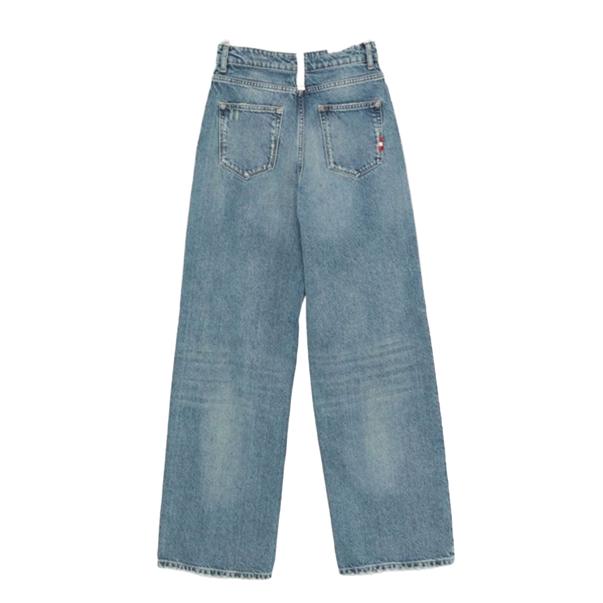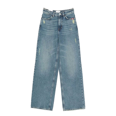 Jeans "Linda" in denim con leggere baffature sul fronte di Amish, con vita media con passanti, salpa e iconico passante in tessuto logato sul retro, chiusura con bottone logato e zip, due tasche sul fronte e due tasche sul retro con ricamo in filo in contrasto. Loose fit.