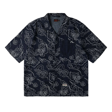 This boxy denim short-sleeve shirt features an allover leopard and cloud motif print that mixes Eastern mythology flair with a bold street attitude. Made from 100% Cotton with a relaxed square silhouette and a contrast indigo chest pocket, it’s an easy statement layer for warm-weather styling.