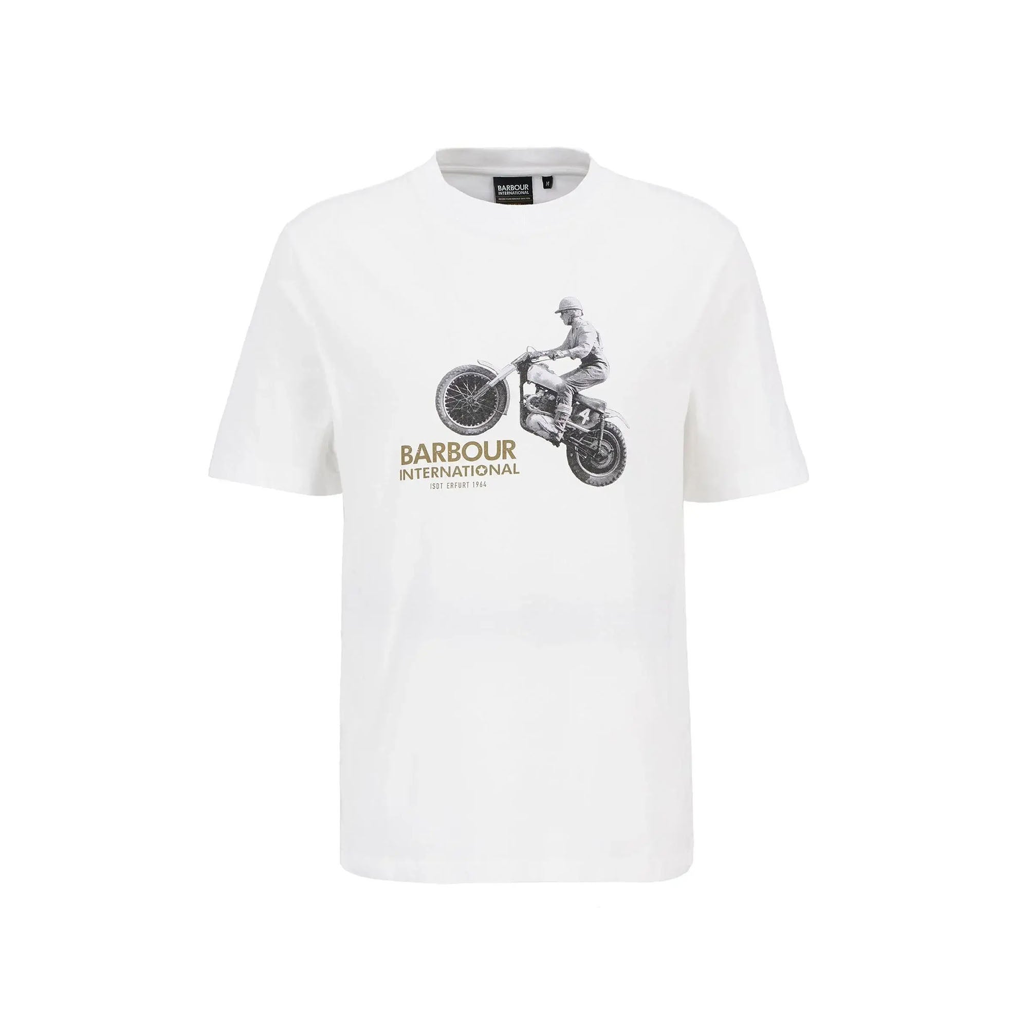 While traveling to participate in the 1964 International Six Day Trials in East Germany, Steve McQueen and the U.S. national team stopped in London to purchase Barbour International suits. To pay tribute to this iconic competition, B.Intl's Jump T-shirt features just such a print depicting Steve McQueen at the ISDT