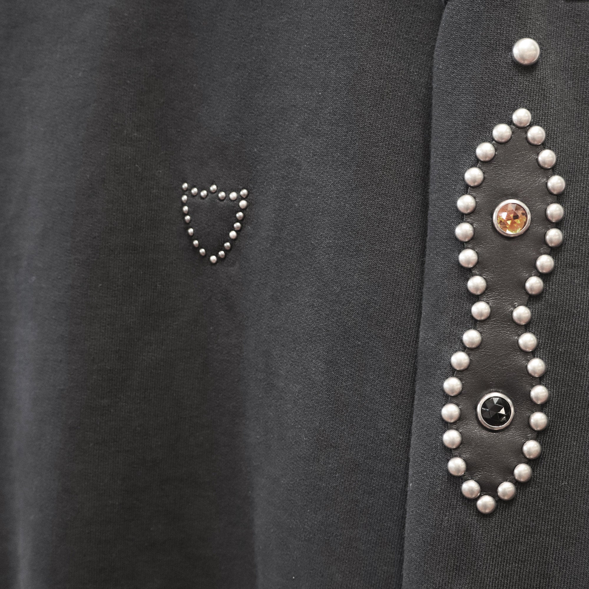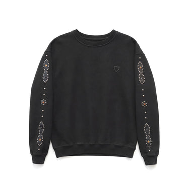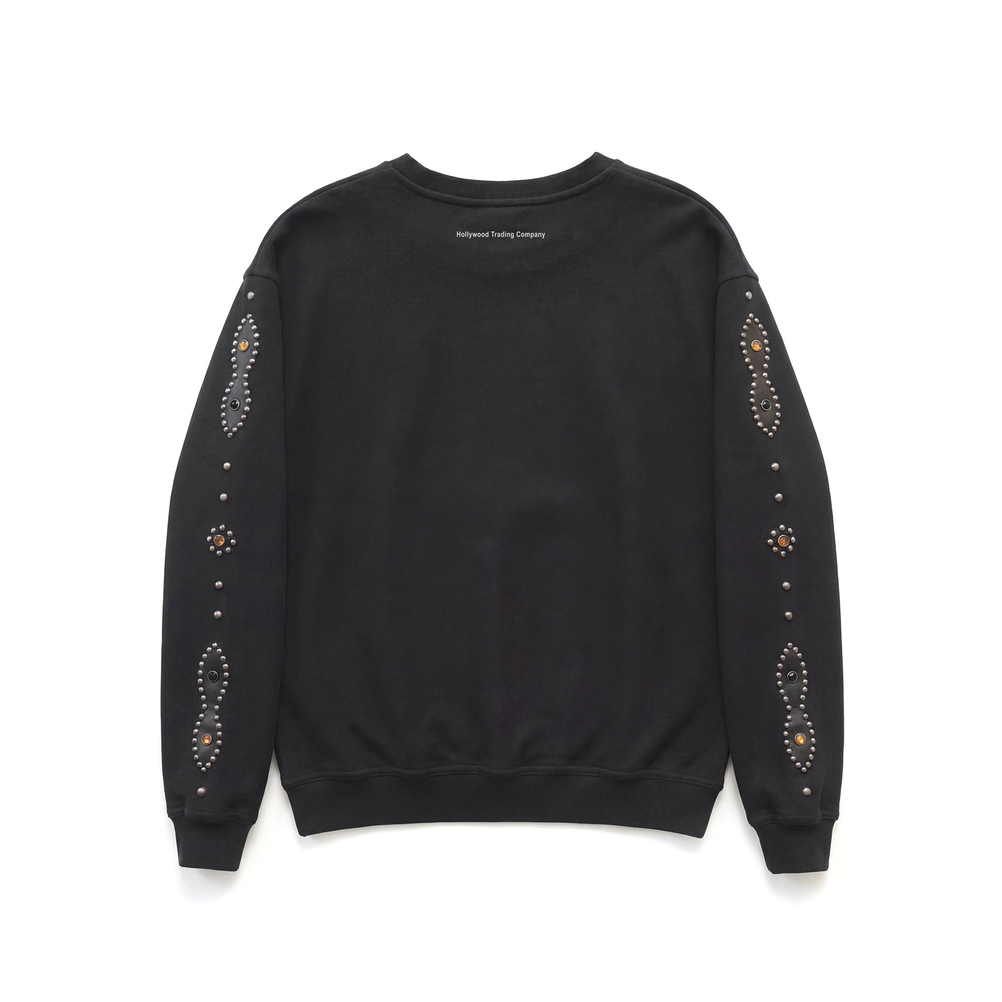 Black oversize fit sweater, featuring a small studded shield on the chest, studded "moustache" patterns along the sleeves, and a white "Hollywood Trading Company" logo print on the back. Crafted in Italy, 100% cotton.