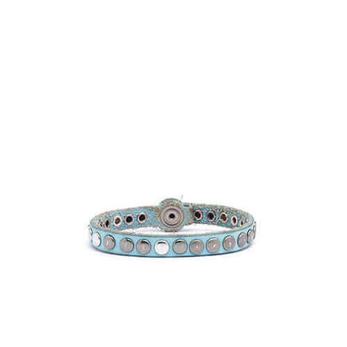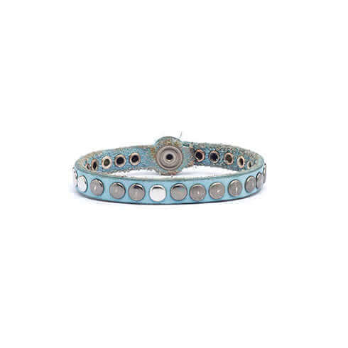 Light blue leather bracelet with studs, zamac button closure with carved HTC Los Angeles logo. Size M lenght: 20cm; Size S lenght: 19cm. 100% Made in Italy.
