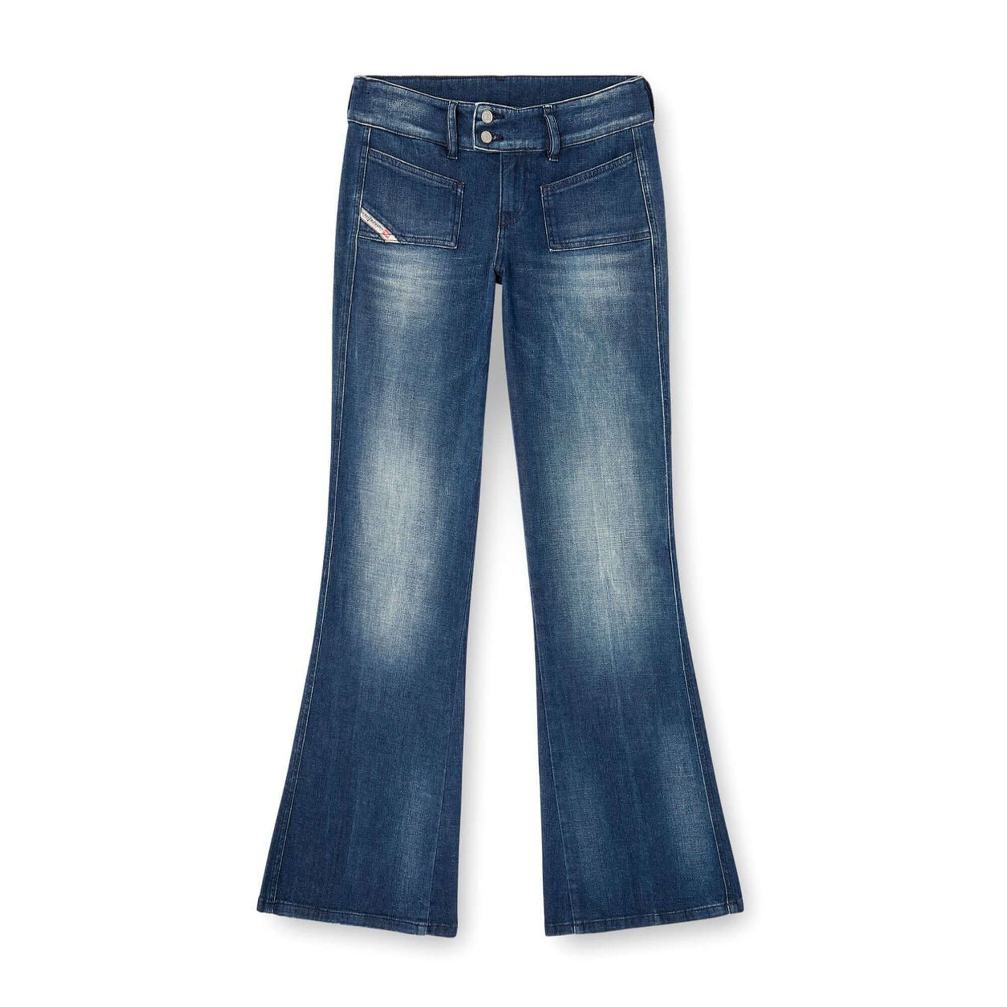 Bootcut fit with low waist and slim leg. A contemporary version of Diesel's iconic jeans from the 2000s, it features the distinctive patch pockets and double-button closure of the archival pattern. Decorative stitching under the back pockets creates a shaded version of the iconic Eagle pattern.