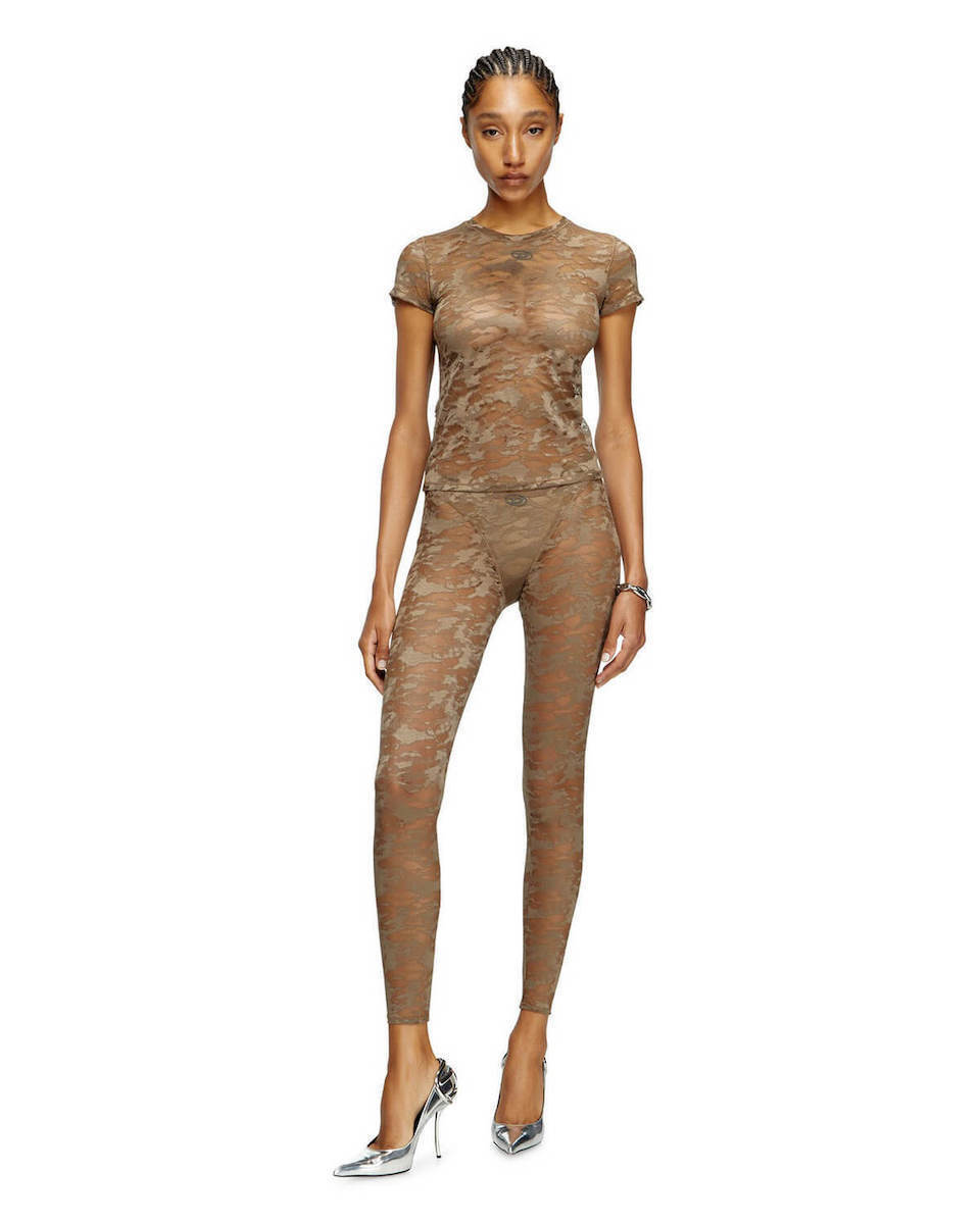 Short-sleeved blouse with a round neckline and semi-transparent fabric. Decorated with a logo on the chest.