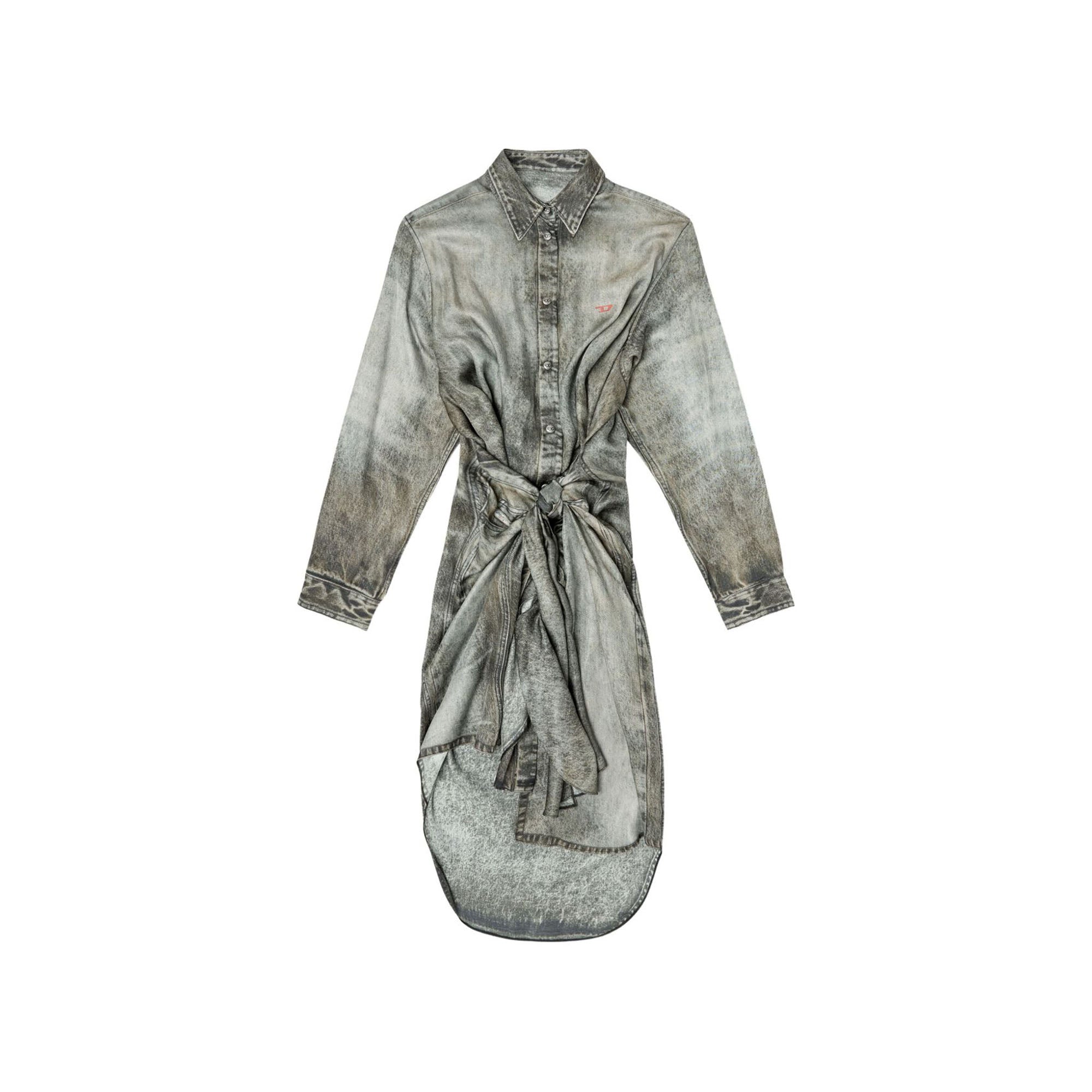 Abito di colore grigio con chiusura frontale con bottoni a pressione, polsini con bottoni a pressione, due tasche laterali a filetto e mini etichetta con logo.