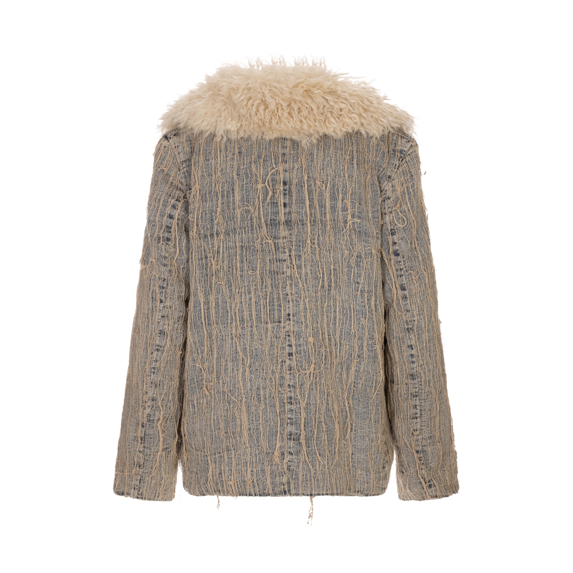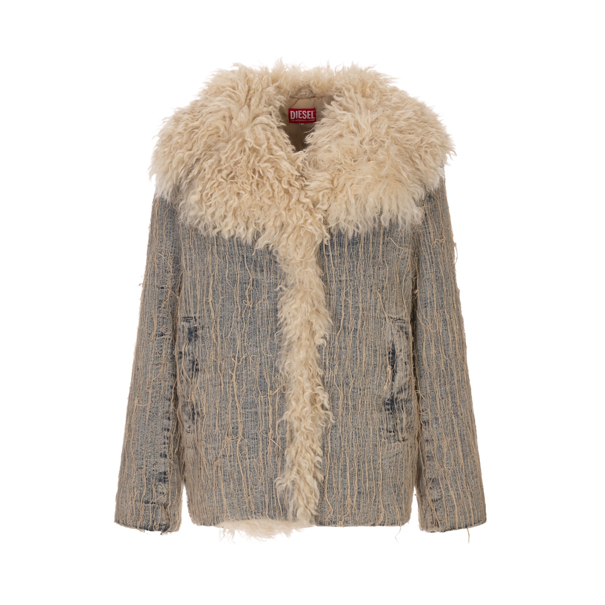 Leggermente imbottita per tenere al caldo, questa giacca Diesel da donna è tagliata con una silhouette dritta ed è caratterizzata da maxi revers con una texture morbida e riccia. Il capo è realizzato in un tessuto jacquard che reinterpreta la trama classica del denim, caratterizzato da fili fluttuanti. Un esempio del know-how artigianale di Diesel, il look è ulteriormente arricchito da un trattamento stone wash marmorizzato. Un secondo lavaggio colorato nei toni del beige dona profondità e contrasto cromatico al design. Il risultato è audace, distressed e al tempo stesso raffinato.