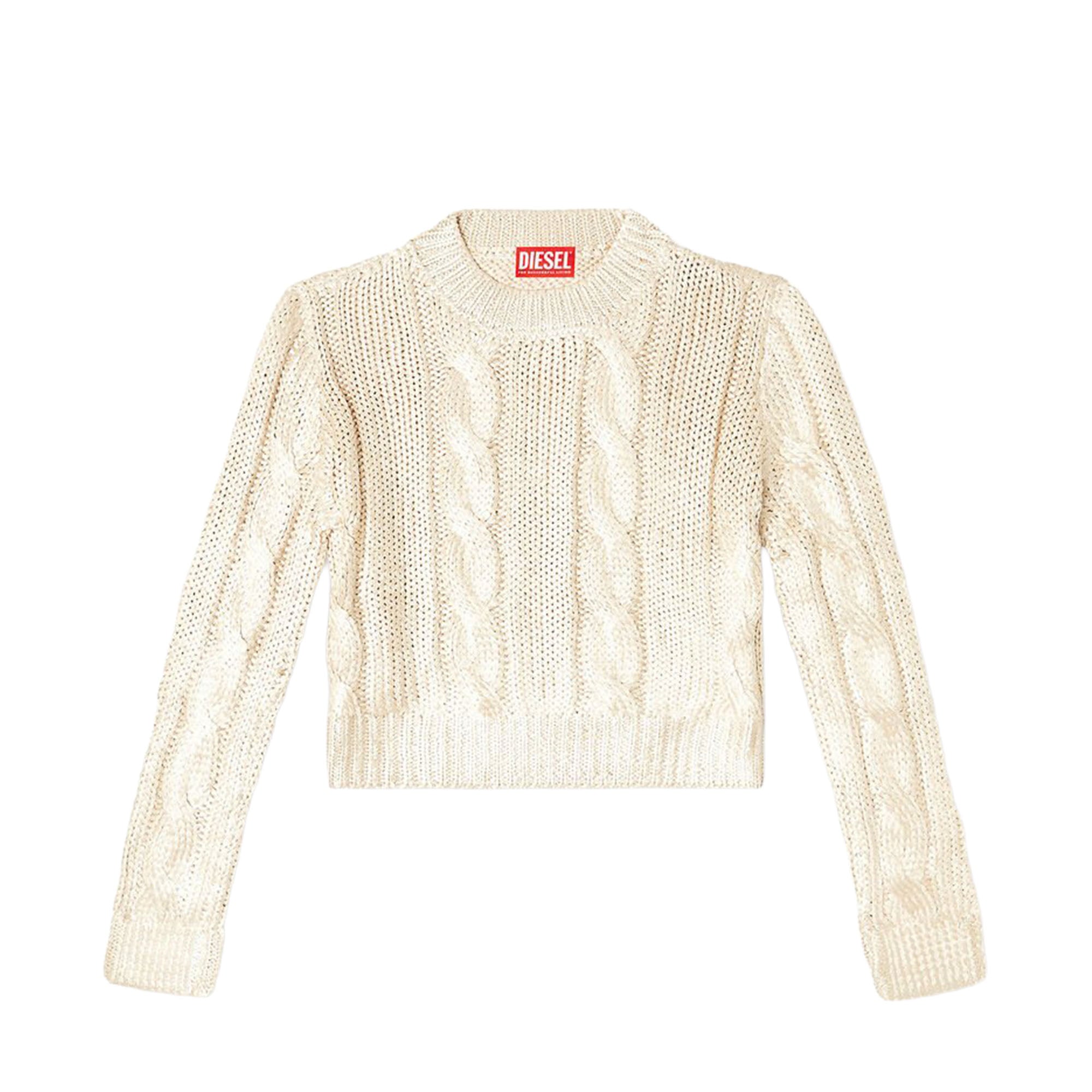 Un esercizio di sovversione della maglieria, questo maglione da donna brilla con una luminosità intensa. È lavorato a maglia con trecce classiche sul davanti e sulle maniche, poi termo-pressato per ottenere una finitura contemporanea.