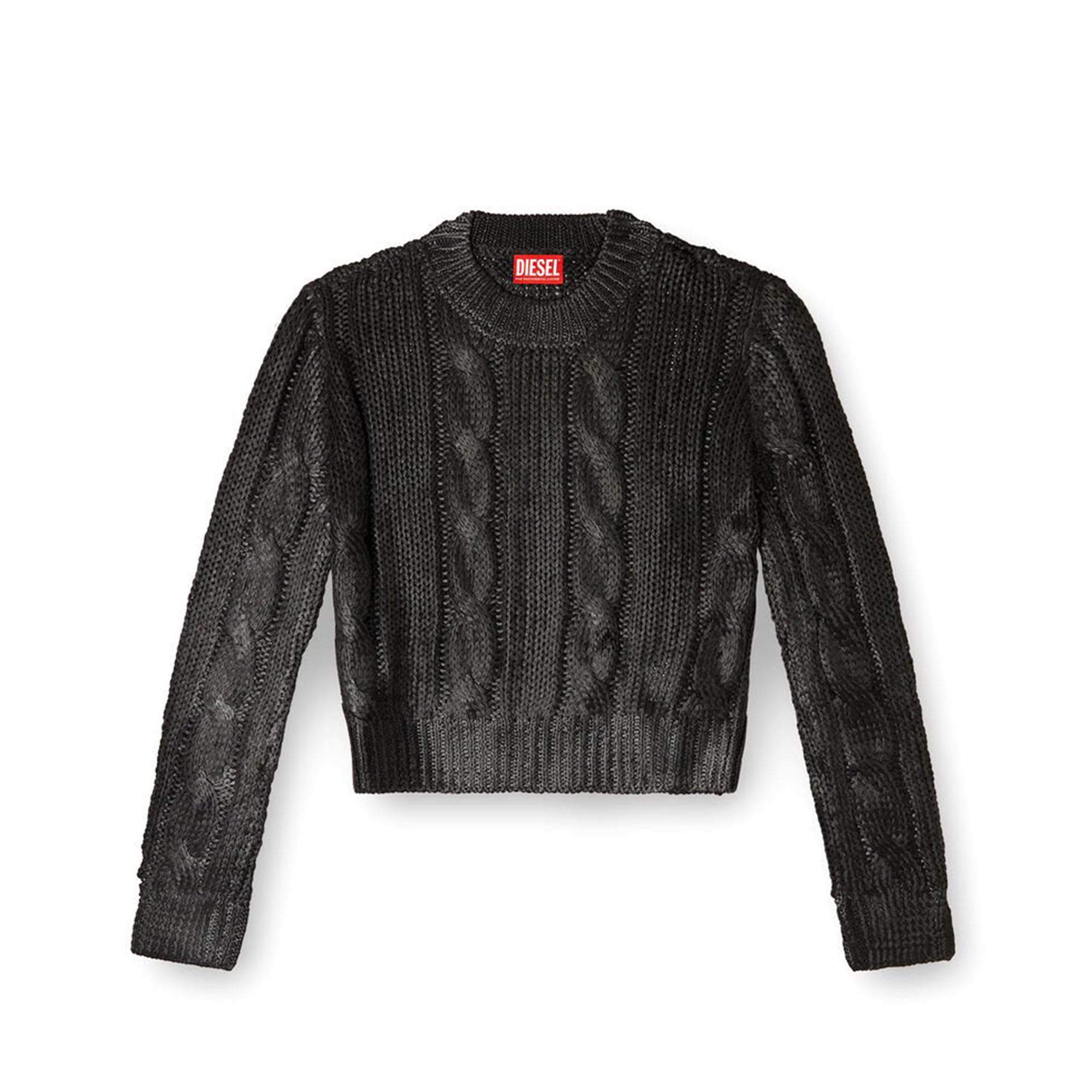 Un esercizio di sovversione della maglieria, questo maglione da donna brilla con una luminosità intensa. È lavorato a maglia con trecce classiche sul davanti e sulle maniche, poi termo-pressato per ottenere una finitura contemporanea.