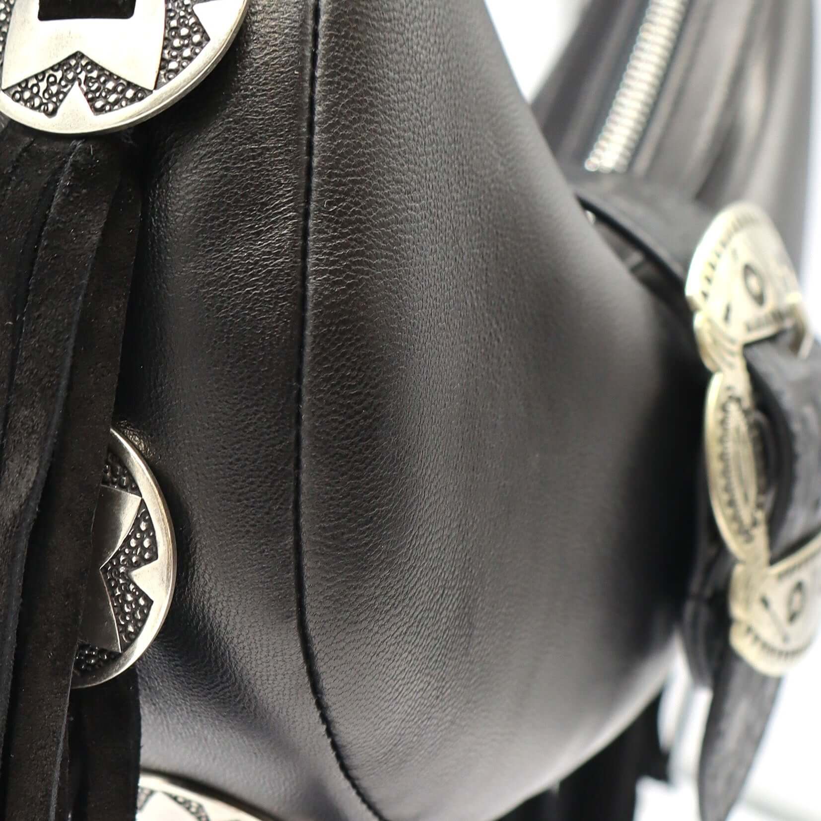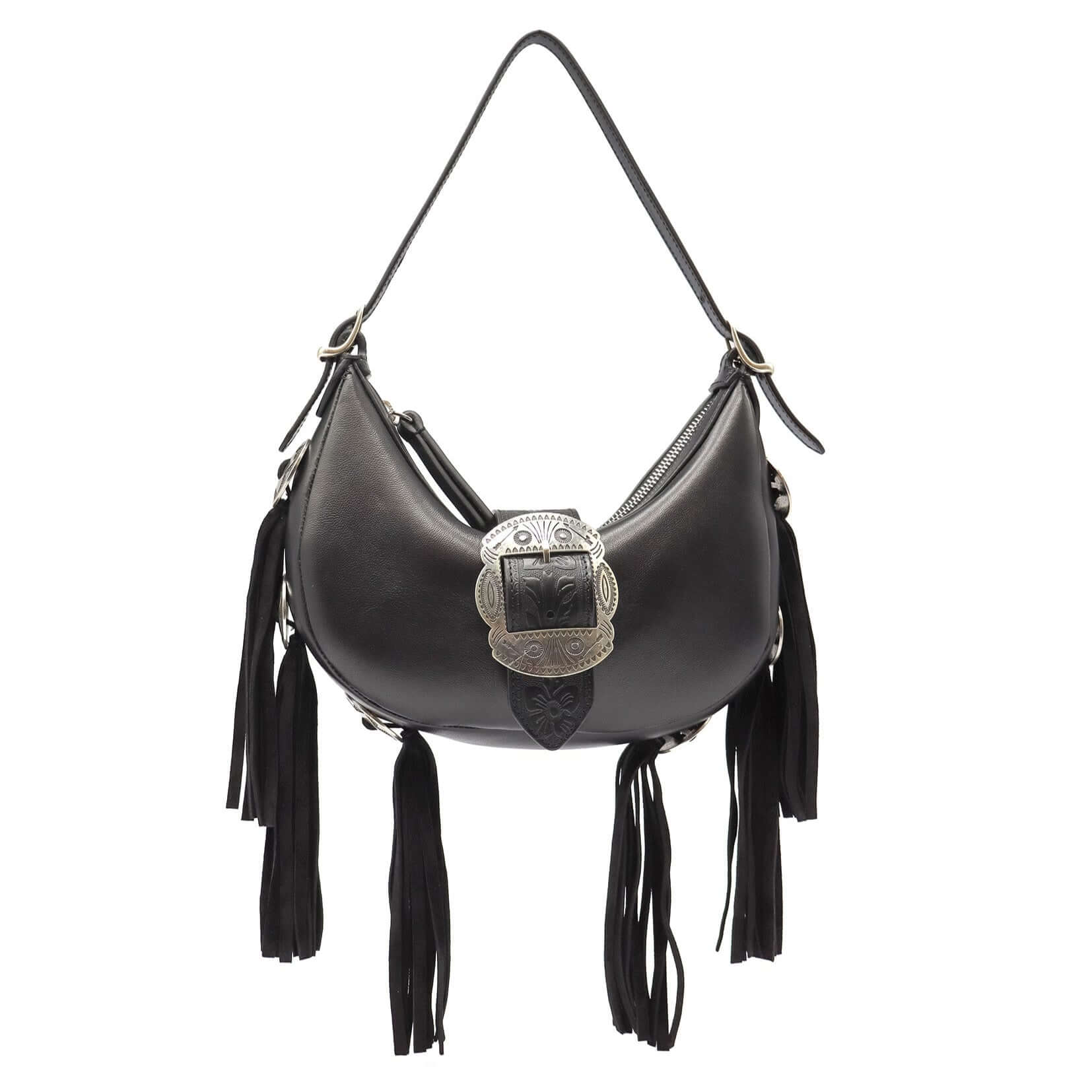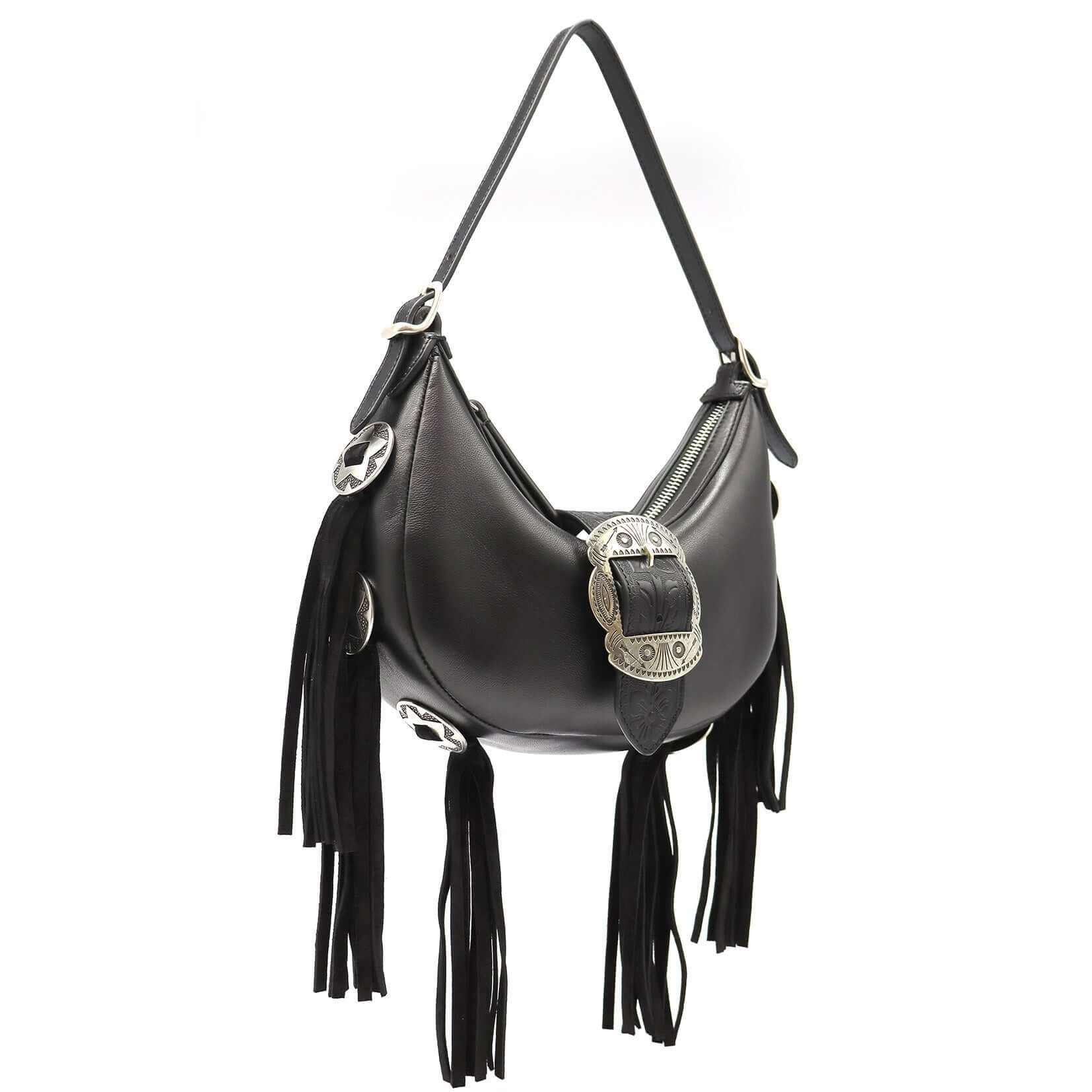 Moon bag in Black, featuring a zip closure, fringes and concho-details.