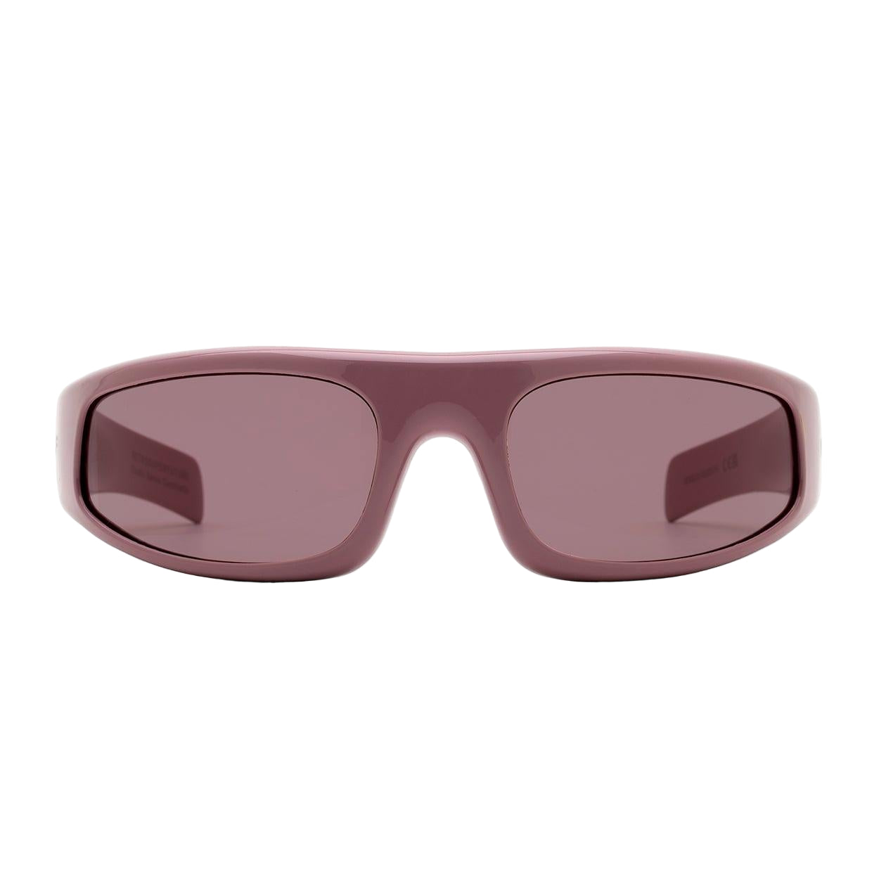 Custom made semicircle, lightweight and hingeless powder pink nylon frame. Mounting tone-on-tone wrap around lenses in pink. Premium eyewear designed in Milano, Italy.