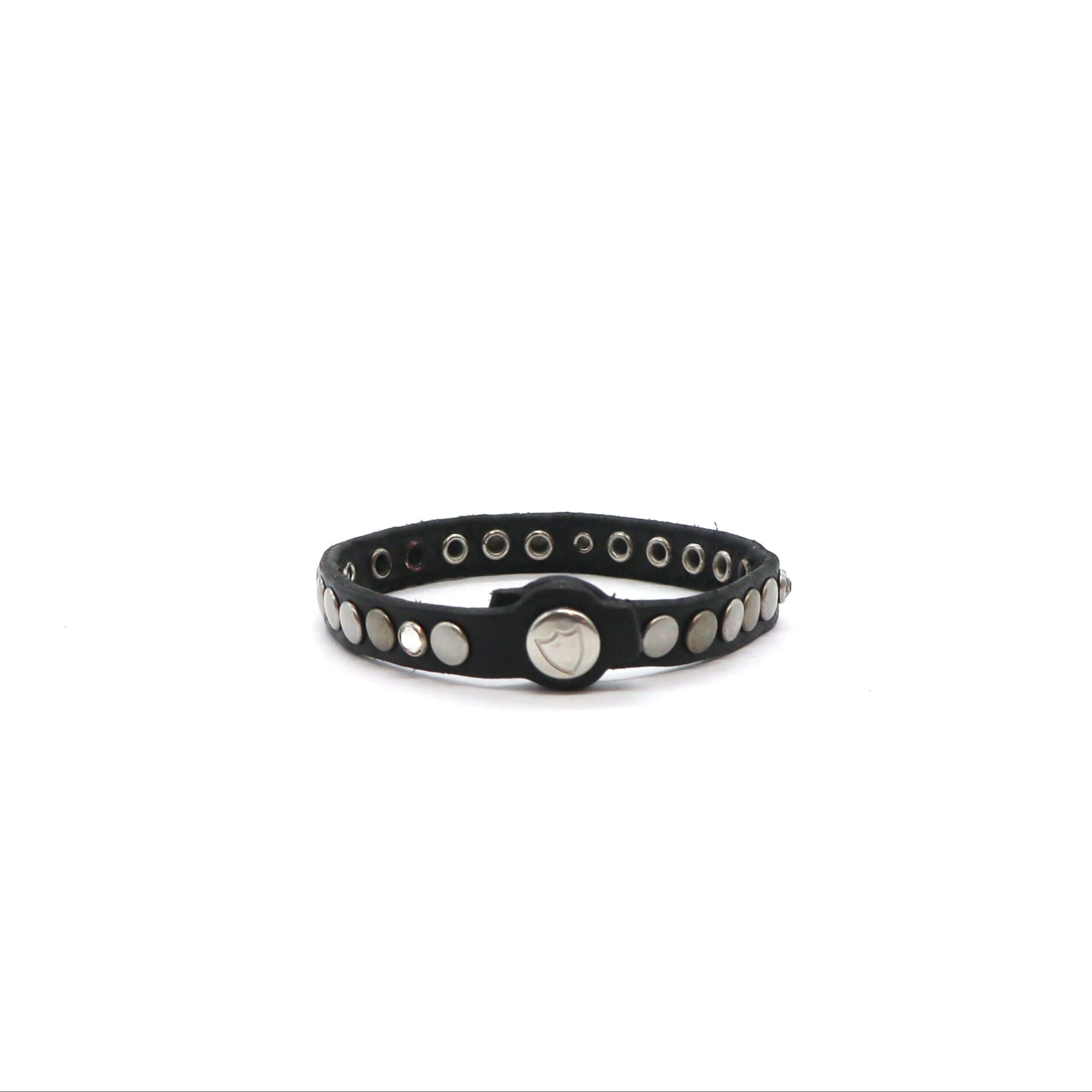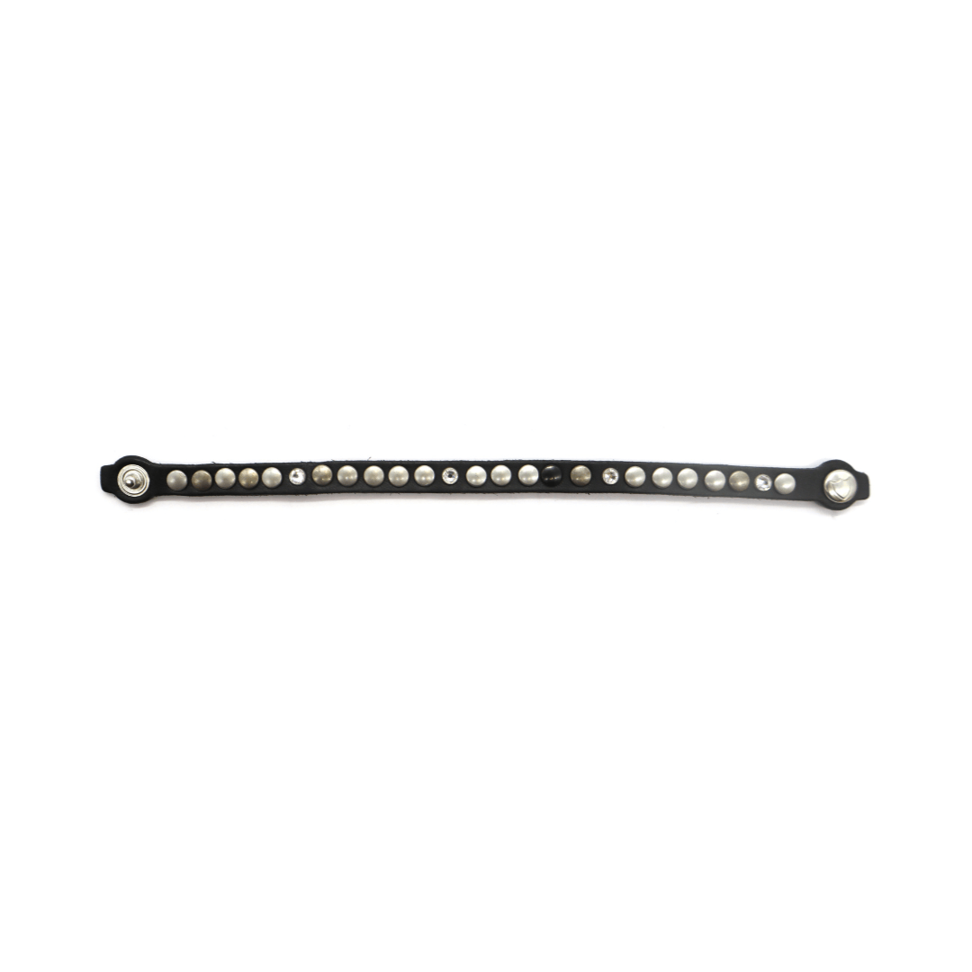 Black leather bracelet with studs and rhinestones, zamac button closure with carved HTC Los Angeles logo. 100% Made in Italy.