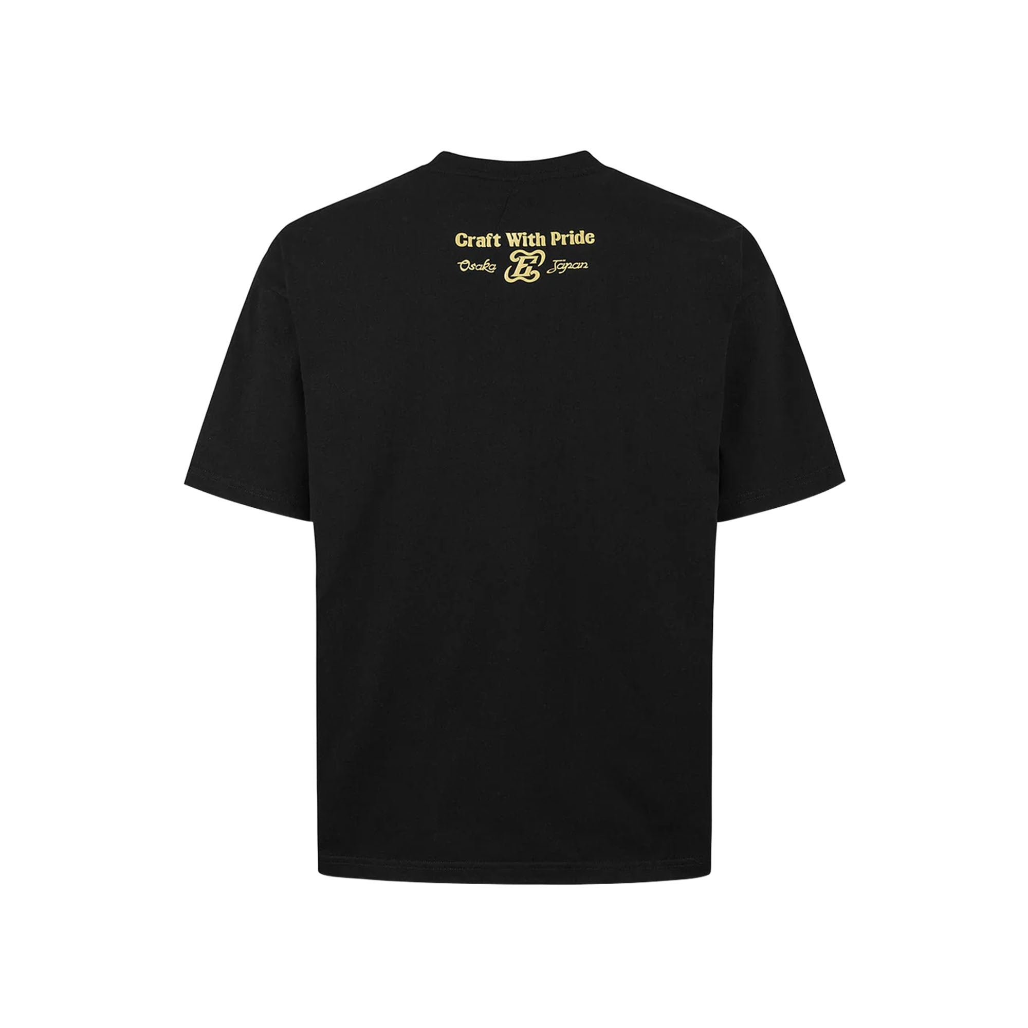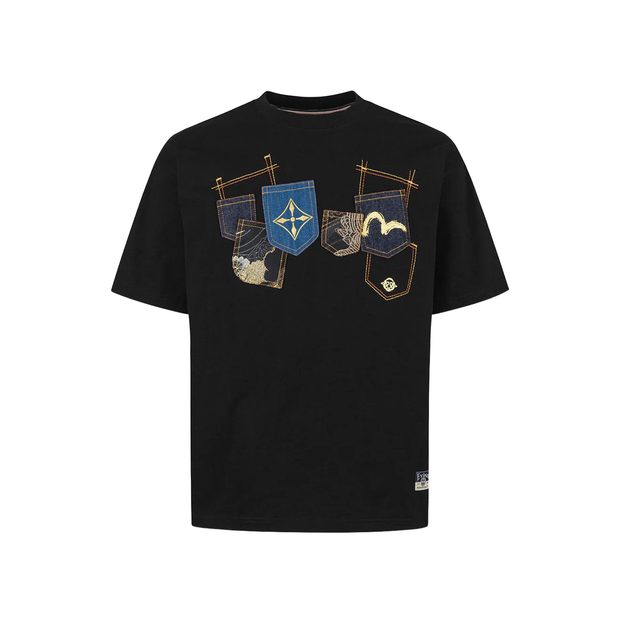 This T-shirt features an embroidered pocket made of denim and a faux pocket created with stitching on the front. The pockets are adorned with Kamon, Seagull, and other Japanese elements, adding a unique touch of detail. The back showcases various slogans and logos in different fonts, presenting a perfect blend of personality and style.