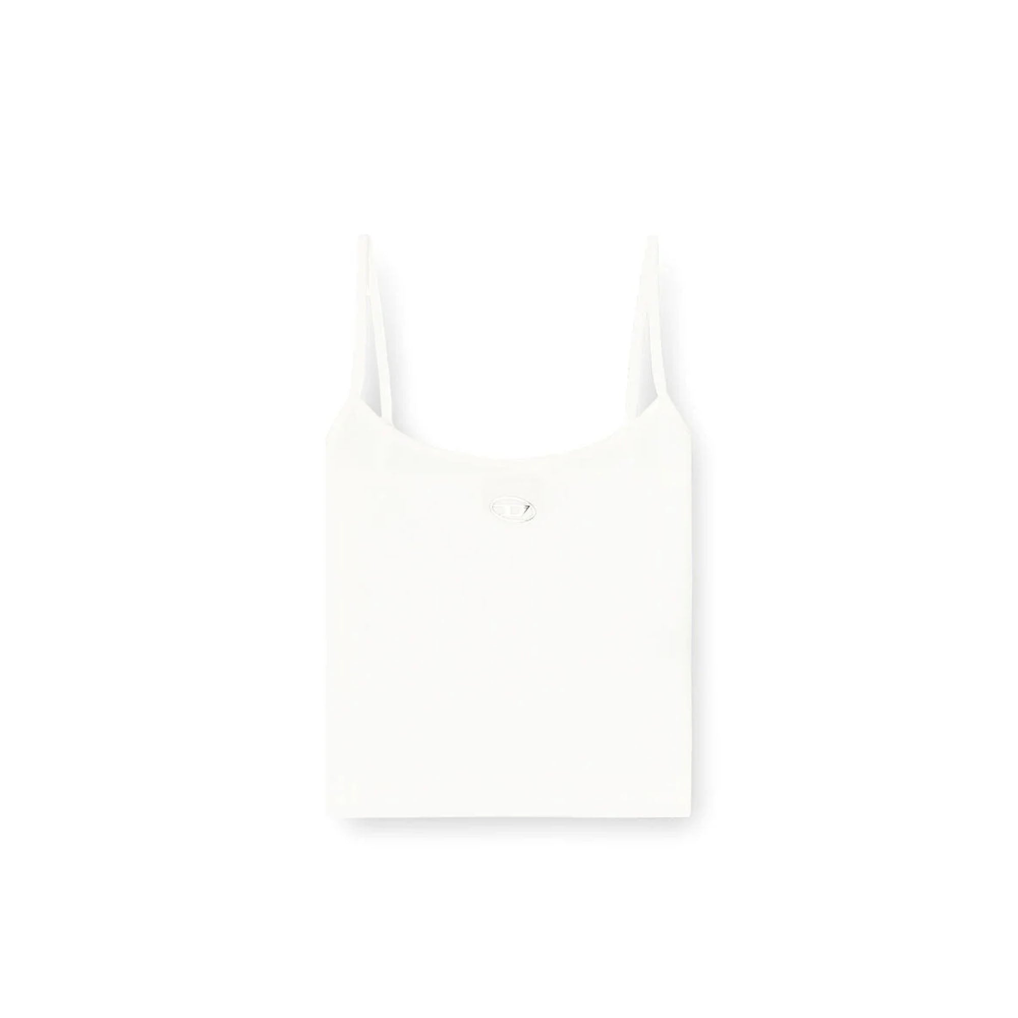 Top slim fit con spalline sottili e scollo rotondo. Realizzato in cotone elasticizzato a costine fini, garantisce comfort e libertà di movimento. Caratteristica distintiva è il logo Oval D metallizzato stampato a iniezione in rilievo sotto lo scollo.