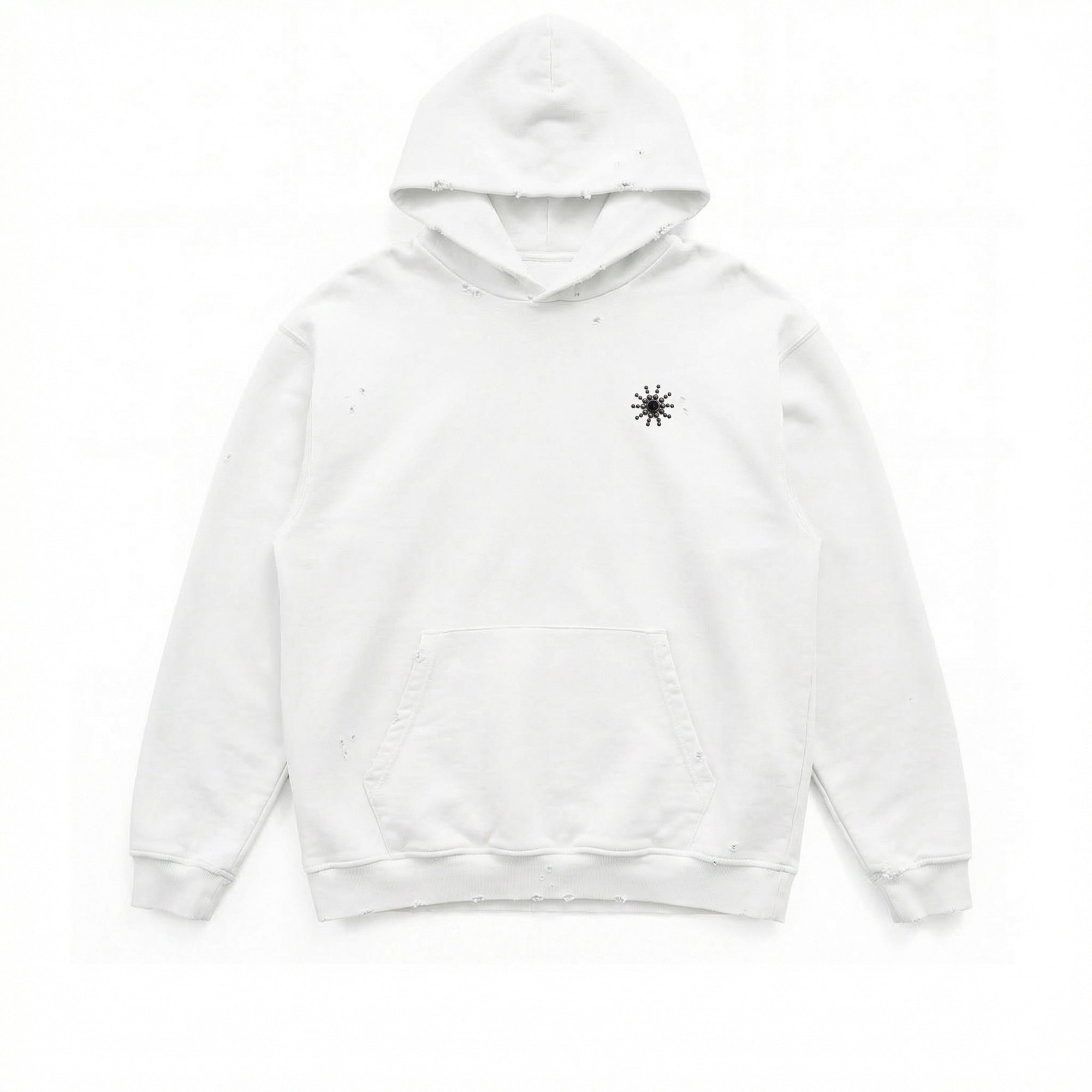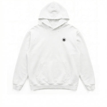 White oversize fit hoodie with a vintage wash, featuring a studded sun motif on the chest with a central black gemstone accent, complemented by distressed detailing. Crafted in Italy, 100% cotton.