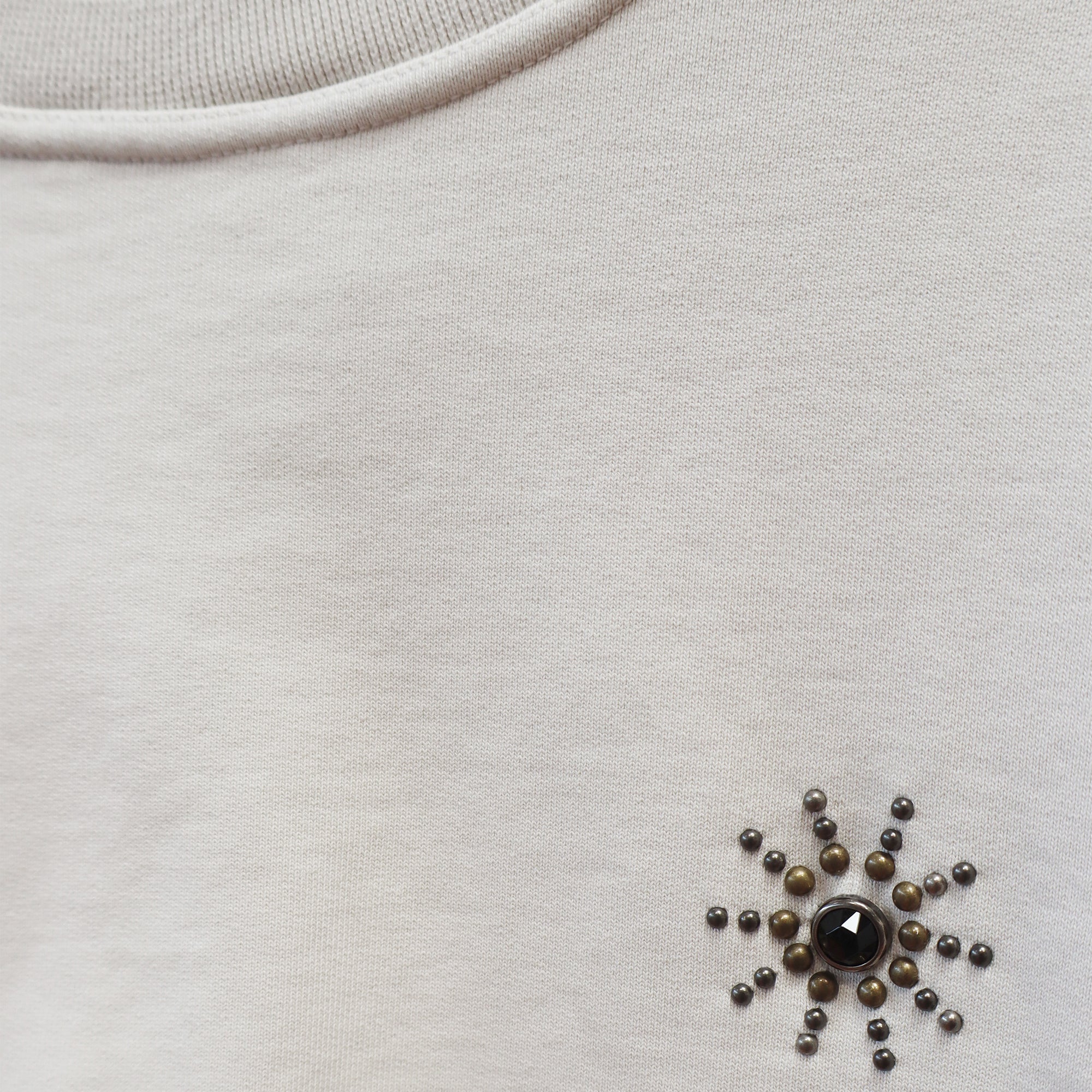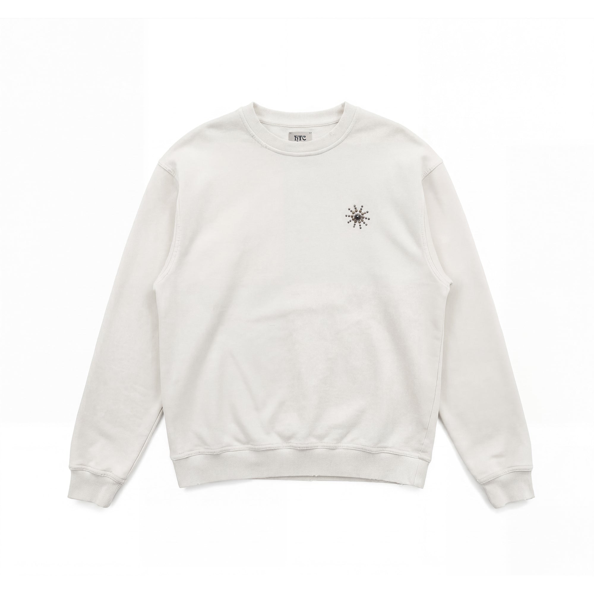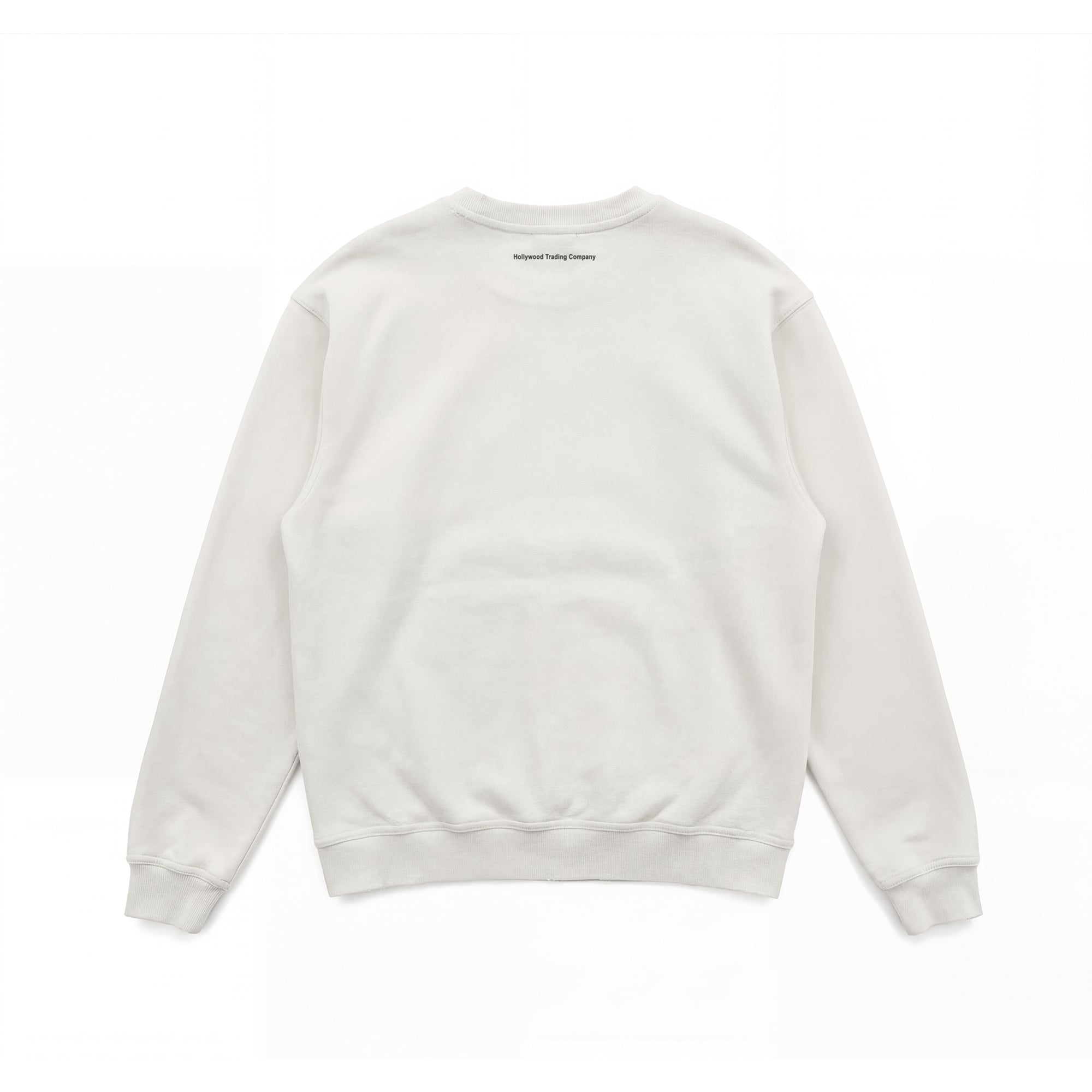 Off-white oversize fit sweater, featuring a small studded sun with a dark stone on the chest and a black "Hollywood Trading Company" logo print on the back. Crafted in Italy, 100% cotton.