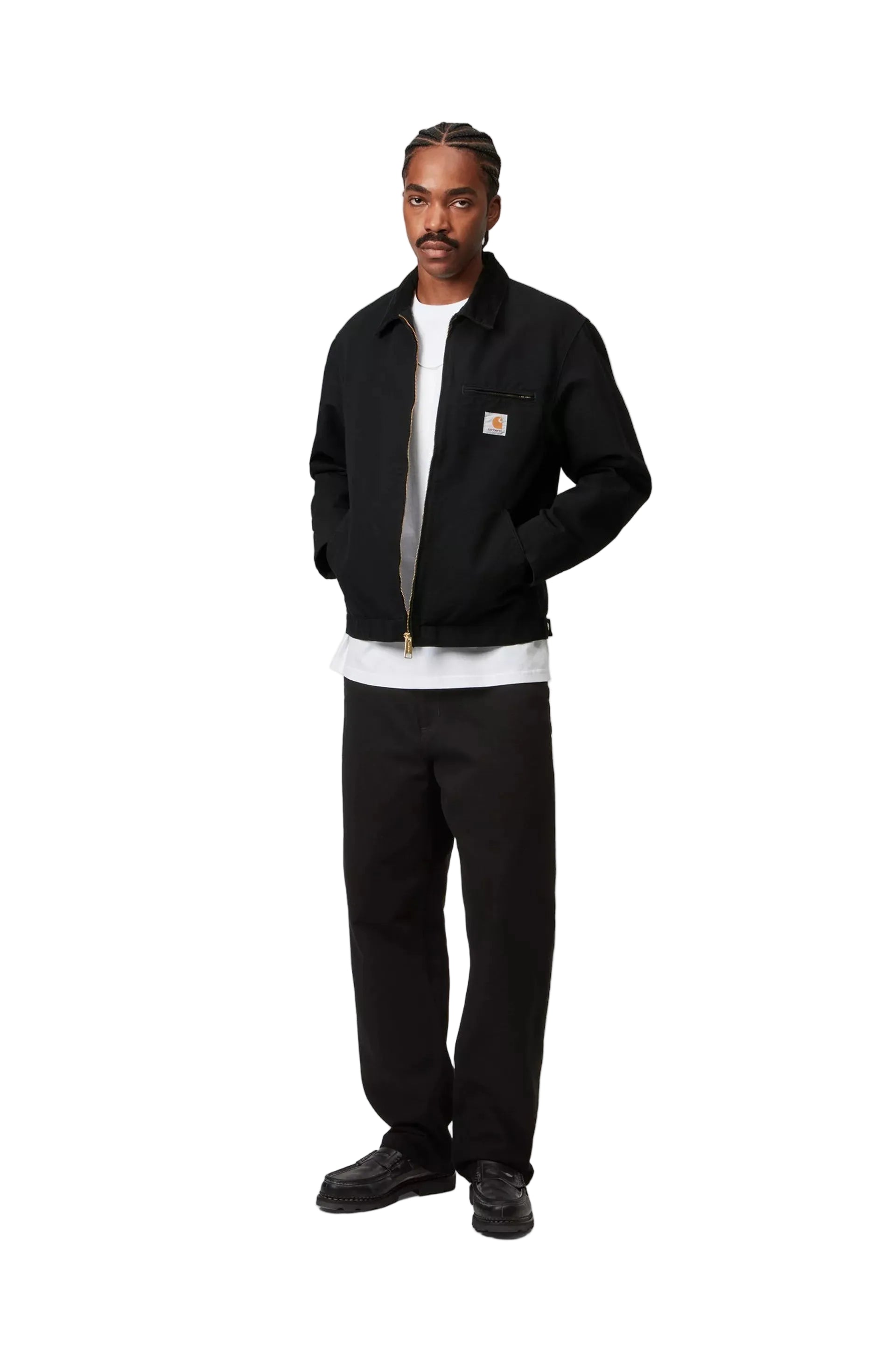 La Detroit Jacket è un modello non foderato realizzato in pesante tela Dearborn con colletto in velluto. La giacca è caratterizzata da chiusura anteriore con zip e polsini e orlo regolabili tramite bottoni automatici. Sul petto presenta un’etichetta quadrata in tessuto.