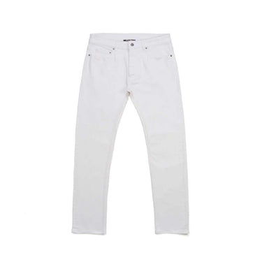 Slim fit jeans in white denim, 5 pockets, hidden front button closure. Metallic logo detail on the back. 100% cotton. Made in Italy.